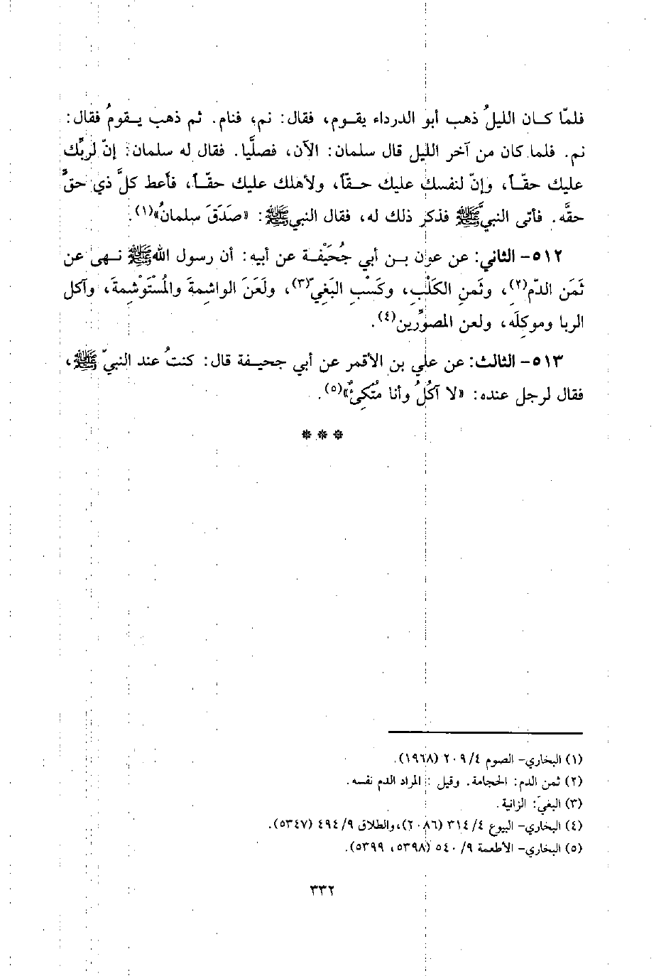 512 - الثَّانِي: عَن عون بن أبي جُحَيْفَة عَن أَبِيه: أَن رَسُول الله صلى الله عَلَيْهِ وَسلم نهى عَن ثمن الدَّم، وَثمن الْكَلْب، وَكسب الْبَغي، وَلعن الواشمة والمستوشمة، وآكل الرِّبَا وموكله، وَلعن المصورين.