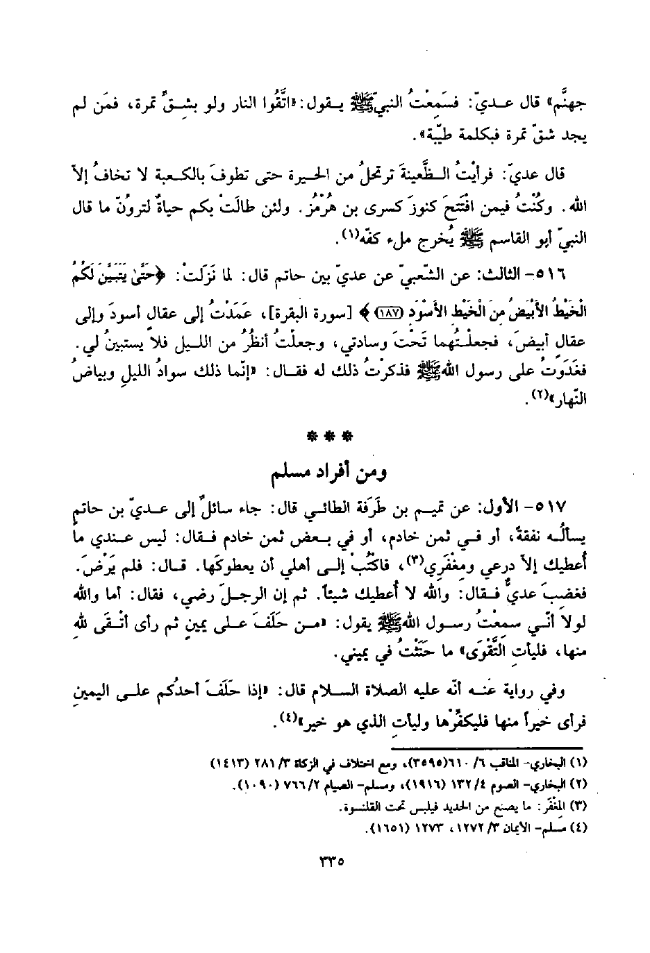 516 - الثَّالِث: عَن الشّعبِيّ عَن عدي بن حَاتِم قَالَ: لما نزلت: {حَتَّى يتَبَيَّن لكم الْخَيط الْأَبْيَض من الْخَيط الْأسود} [سُورَة الْبَقَرَة] ، عَمَدت إِلَى عقال أسود وَإِلَى عقال أَبيض، فَجَعَلتهمَا تَحت وِسَادَتِي، وَجعلت أنظر من اللَّيْل فَلَا يستبين لي.