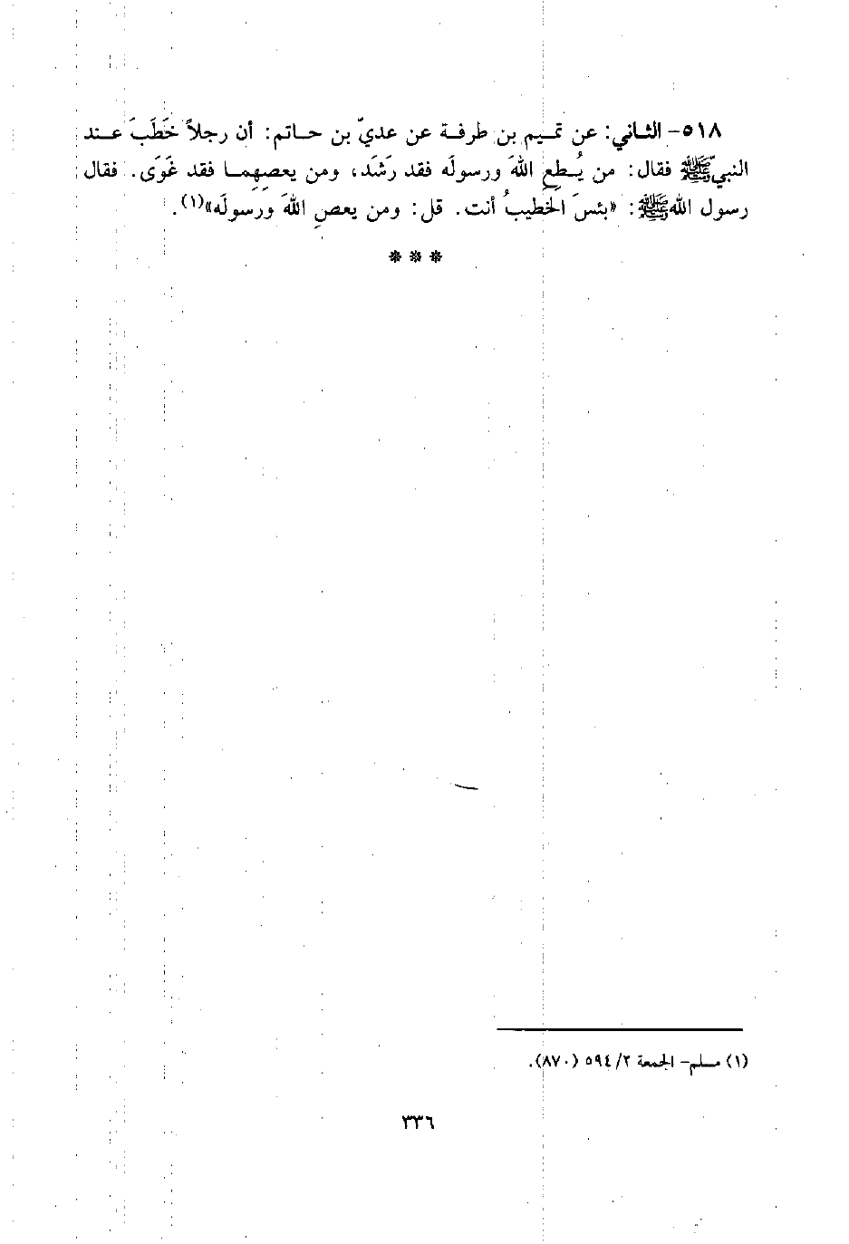 518 - الثَّانِي: عَن تَمِيم بن طرفَة عَن عدي بن حَاتِم: أَن رجلا خطب عِنْد النَّبِي صلى الله عَلَيْهِ وَسلم فَقَالَ: من يطع الله وَرَسُوله فقد رشد، وَمن يعصهما فقد غوى. فَقَالَ رَسُول الله صلى الله عَلَيْهِ وَسلم: " بئس الْخَطِيب أَنْت. قل: وَمن يعْص الله وَرَسُوله ".