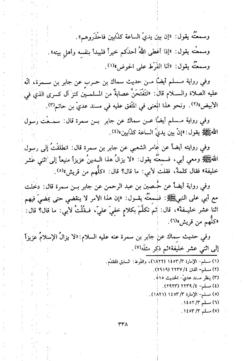 وَفِي رِوَايَته أَيْضا عَن عَامر الشّعبِيّ عَن جَابر بن سَمُرَة قَالَ: انْطَلَقت إِلَى رَسُول الله صلى الله عَلَيْهِ وَسلم وَمَعِي أبي، فَسَمعته يَقُول: " لَا يزَال هَذَا الدّين عَزِيزًا منيعاً إِلَى اثْنَي عشر خَليفَة " فَقَالَ كلمة، فَقلت لأبي: مَا قَالَ؟ قَالَ: " كلهم من قُرَيْش ".