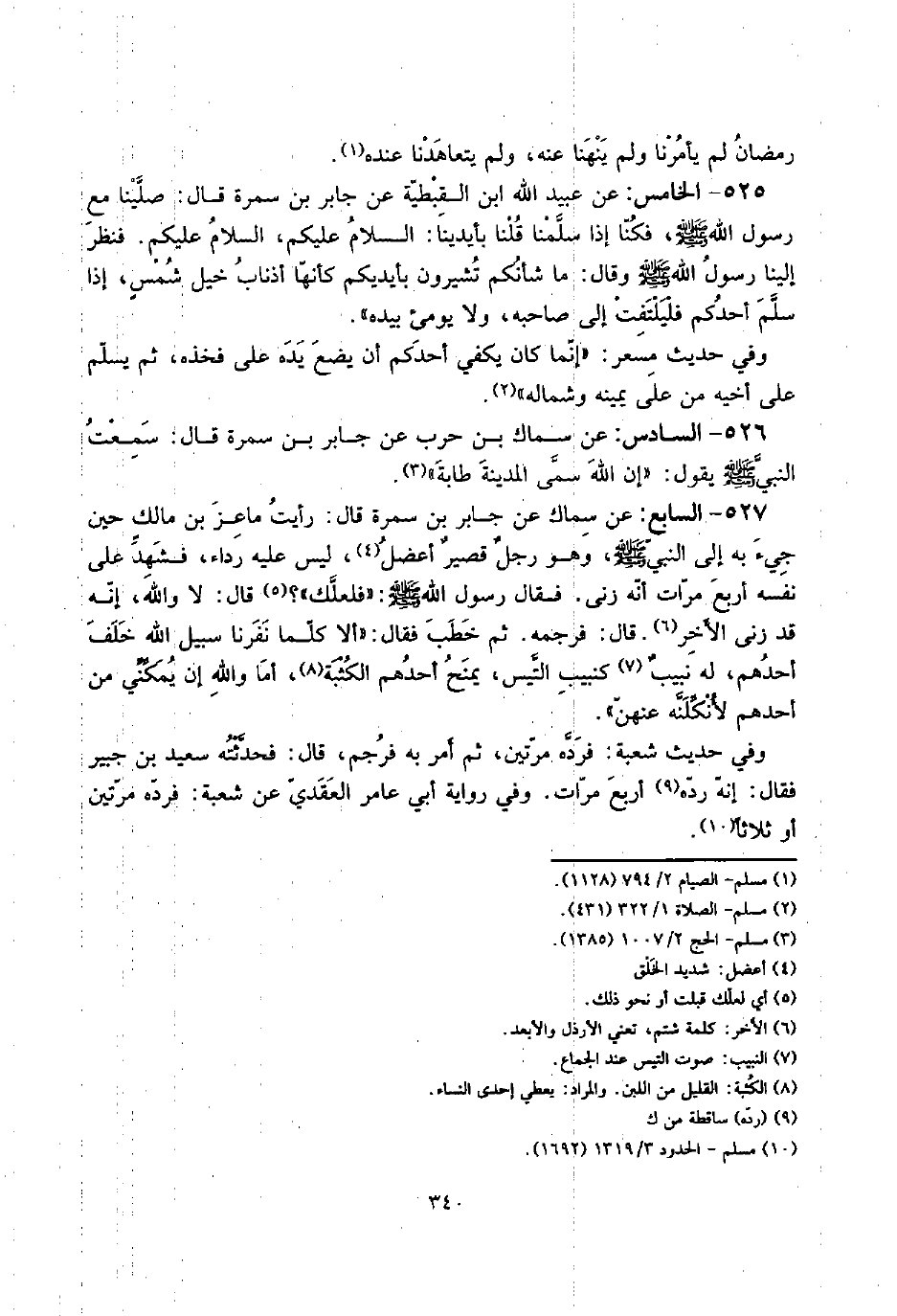 527 - السَّابِع: عَن سماك عَن جَابر بن سَمُرَة قَالَ: رَأَيْت مَاعِز بن مَالك حِين جِيءَ بِهِ إِلَى النَّبِي صلى الله عَلَيْهِ وَسلم، وَهُوَ رجلٌ قصيرٌ أعضل، لَيْسَ عَلَيْهِ رِدَاء، فَشهد على نَفسه أَربع مَرَّات أَنه زنى. فَقَالَ رَسُول الله صلى الله عَلَيْهِ وَسلم: " فلعلك "؟ قَالَ: لَا وَالله، إِنَّه قد زنى الْأُخَر. قَالَ: فرجمه. ثمَّ خطب فَقَالَ: " أَلا كلما نفرنا سَبِيل الله خلف أحدهم، لَهُ نبيبٌ كنبيب التيس، يمنح أحدهم الكثبة، أما وَالله إِن يمكني من أحدهم لأنكلنه عَنْهُن ".
