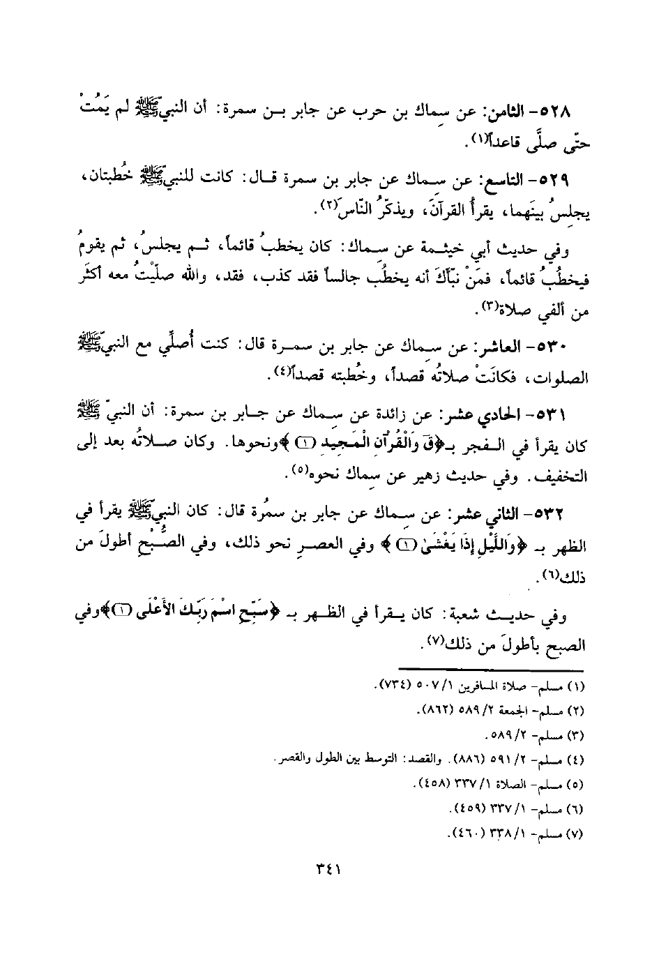 530 - الْعَاشِر: عَن سماك عَن جَابر بن سَمُرَة قَالَ: كنت أُصَلِّي مَعَ النَّبِي صلى الله عَلَيْهِ وَسلم الصَّلَوَات، فَكَانَت صلَاته قصدا، وخطبته قصدا.