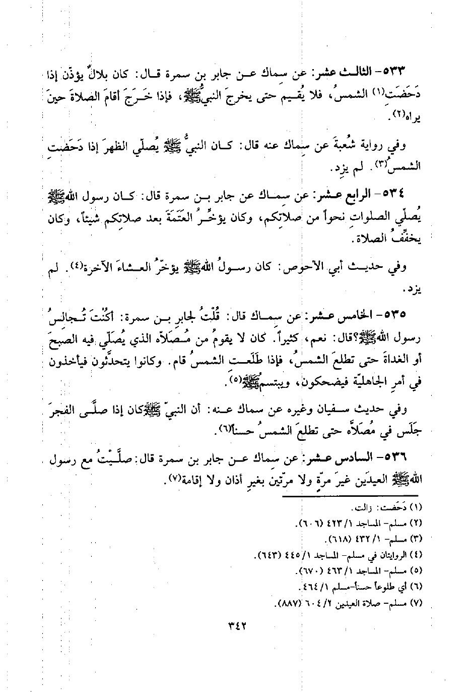 534 - الرَّابِع عشر: عَن سماك عَن جَابر بن سَمُرَة قَالَ: كَانَ رَسُول الله صلى الله عَلَيْهِ وَسلم يُصَلِّي الصَّلَوَات نَحوا من صَلَاتكُمْ، وَكَانَ يُؤَخر الْعَتَمَة بعد صَلَاتكُمْ شَيْئا، وَكَانَ يُخَفف الصَّلَاة.