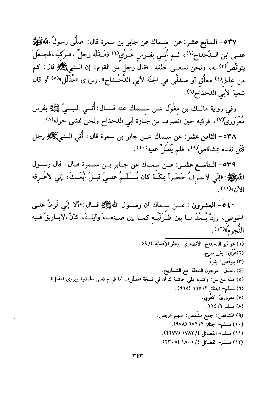 537 - السَّابِع عشر: عَن سماك عَن جَابر بن سَمُرَة قَالَ: صلى رَسُول الله صلى الله عَلَيْهِ وَسلم على ابْن الدحداح، ثمَّ أُتِي بفرسٍ عريٍ فعقله رجلٌ، فَرَكبهُ، فَجعل يتوقص بِهِ، وَنحن نسعى خَلفه. فَقَالَ رجل من الْقَوْم: