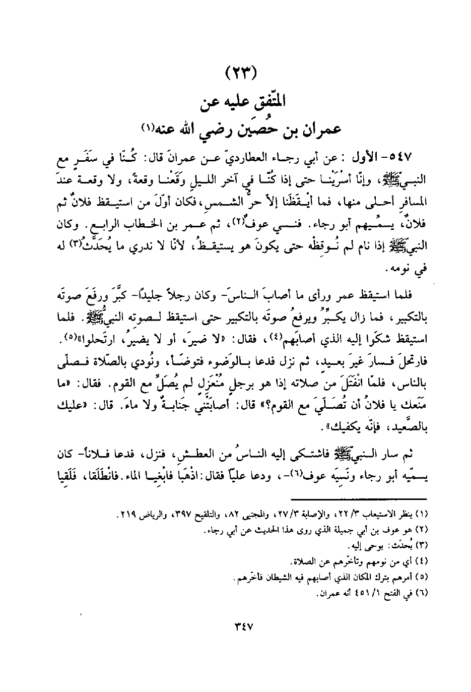 547 - الأول: عَن أبي رَجَاء العطاردي عَن عمرَان قَالَ: كُنَّا فِي سفرٍ مَعَ النَّبِي صلى الله عَلَيْهِ وَسلم، وَإِنَّا أسرينا حَتَّى إِذا كُنَّا فِي آخر اللَّيْل وقعنا وقْعَة، وَلَا وقْعَة عِنْد الْمُسَافِر أحلى مِنْهَا، فَمَا أيقظنا إِلَّا حر الشَّمْس، فَكَانَ أول من اسْتَيْقَظَ فلانٌ ثمَّ فلانٌ، يسميهم أَبُو رَجَاء. فنسي عوفٌ، ثمَّ عمر بن الْخطاب الرَّابِع. وَكَانَ النَّبِي صلى الله عَلَيْهِ وَسلم إِذا نَام لم نوقظه حَتَّى يكون هُوَ يَسْتَيْقِظ، لأَنا لَا نَدْرِي مَا يحدث لَهُ فِي نَومه.