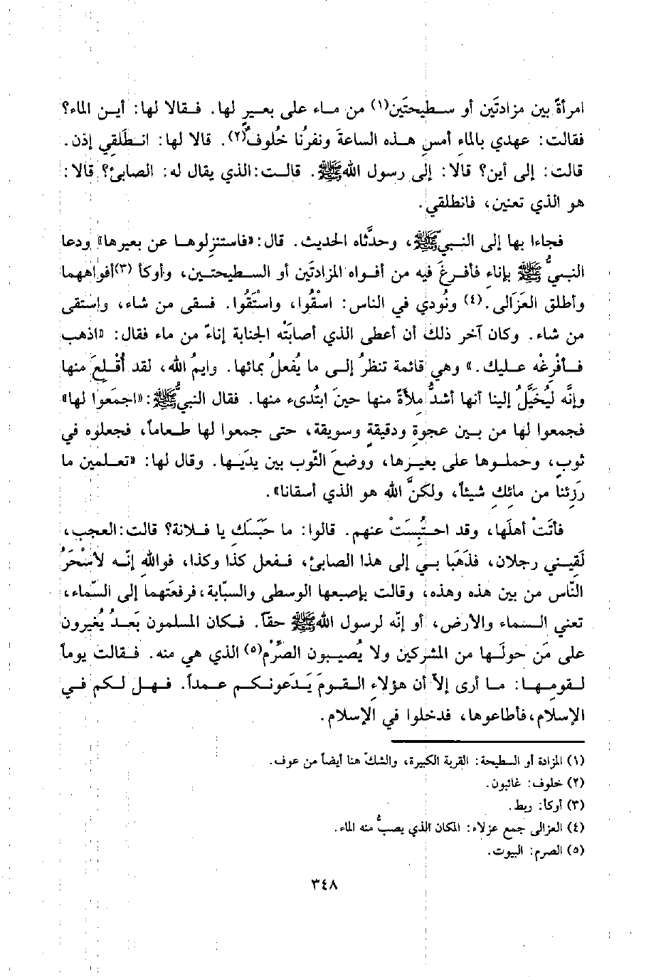 فجاءا بهَا إِلَى النَّبِي صلى الله عَلَيْهِ وَسلم، وحدثاه الحَدِيث. قَالَ: " فاستنزلوها عَن بَعِيرهَا " ودعا النَّبِي صلى الله عَلَيْهِ وَسلم بِإِنَاء فأفرغ فِيهِ من أَفْوَاه المزادتين أَو السطيحتين، وأوكأ أفواههما وَأطلق العزالى. وَنُودِيَ فِي النَّاس: اسقوا واستقوا. فسقى من شَاءَ، واستقى من شَاءَ. وَكَانَ آخر ذَلِك أَن أعْطى الَّذِي أَصَابَته الْجَنَابَة إِنَاء من مَاء فَقَالَ: " اذْهَبْ فأفرغه عَلَيْك؟ " وَهِي قَائِمَة تنظر إِلَى مَا يفعل بِمَائِهَا. وأيم الله، لقد أقلع مِنْهَا وَإنَّهُ ليُخَيل إِلَيْنَا أَنَّهَا أَشد ملأةً مِنْهَا حِين ابتدئ مِنْهَا. فَقَالَ النَّبِي صلى الله عَلَيْهِ وَسلم: " اجْمَعُوا لَهَا " فَجمعُوا لَهَا من بَين عَجْوَة ودقيقةٍ وسويقة، حَتَّى جمعُوا لَهَا طَعَاما، فجعلوه فِي ثوبٍ، وَحملُوهَا على بَعِيرهَا، وَوضع الثَّوْب بَين يَديهَا. وَقَالَ لَهَا: " تعلمين مَا رزئنا من مائك شَيْئا، وَلَكِن الله هُوَ الَّذِي أسقانا ".