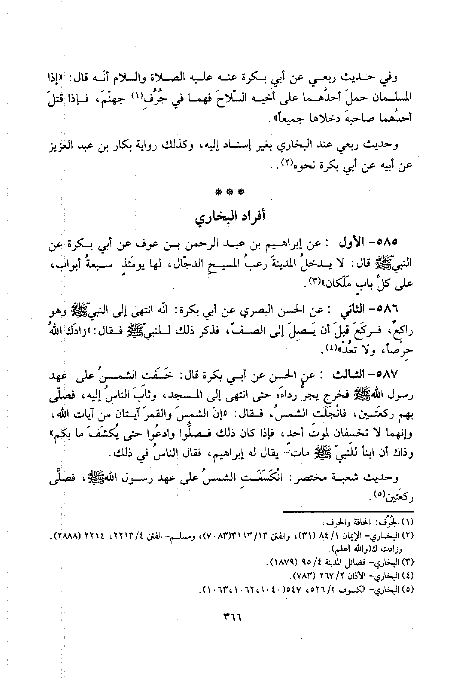 585 - الأول: عَن إِبْرَاهِيم بن عبد الرَّحْمَن بن عَوْف عَن أبي بكرَة عَن النَّبِي صلى الله عَلَيْهِ وَسلم قَالَ: لَا يدْخل الْمَدِينَة رعب الْمَسِيح الدَّجَّال، لَهَا يومئذٍ سَبْعَة أَبْوَاب، على كل بابٍ ملكان ".