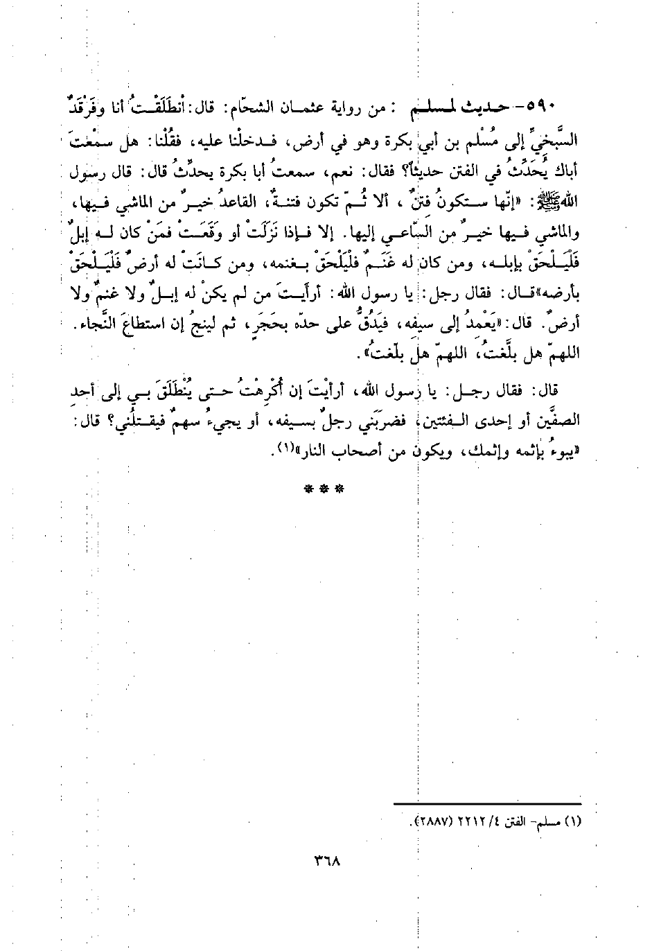 590 - حَدِيث لمُسلم: من رِوَايَة عُثْمَان الشحام: قَالَ: انْطَلَقت انا وفرقدٌ السبخي إِلَى مُسلم بن أبي بكرَة وَهُوَ فِي أَرض، فَدَخَلْنَا عَلَيْهِ، فَقُلْنَا: هَل سَمِعت أَبَاك يحدث فِي الْفِتَن حَدِيثا " فَقَالَ: نعم، سَمِعت أَبَا بكرَة يحدث قَالَ: قَالَ رَسُول الله صلى الله عَلَيْهِ وَسلم: " إِنَّهَا سَتَكُون فتنٌ، أَلا ثمَّ تكون فتنةٌ، الْقَاعِد خيرٌ من الْمَاشِي فِيهَا، والماشي فِيهَا خيرٌ من السَّاعِي إِلَيْهَا. إِلَّا فَإِذا نزلت أَو وَقعت فَمن كَانَ لَهُ إبلٌ فليلحق بإبله، وَمن كَانَ لَهُ غنمٌ فليلحق بغنمه، وَمن كَانَت لَهُ أرضٌ فليلحق بأرضه " قَالَ: فَقَالَ رجل: يَا رَسُول الله: أَرَأَيْت من لم يكن لَهُ إبلٌ وَلَا غنمٌ وَلَا أرضٌ. قَالَ: " يعمد إِلَى سَيْفه، فَيدق على حَده بحجرٍ، ثمَّ لينج إِن اسْتَطَاعَ النَّجَاء.