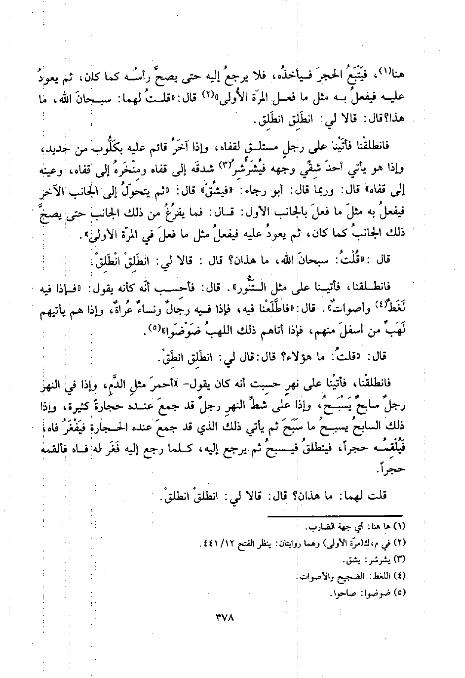 هُنَا، فَيتبع الْحجر فَيَأْخذهُ، فَلَا يرجع إِلَيْهِ حَتَّى يَصح رَأسه كَمَا كَانَ، ثمَّ يعود عَلَيْهِ فيفعل بِهِ مثل مَا فعل الْمرة الأولى " قَالَ: " قلت لَهما: سُبْحَانَ الله، مَا هَذَا؟ قَالَ: قَالَا لي: انْطلق انْطلق.
