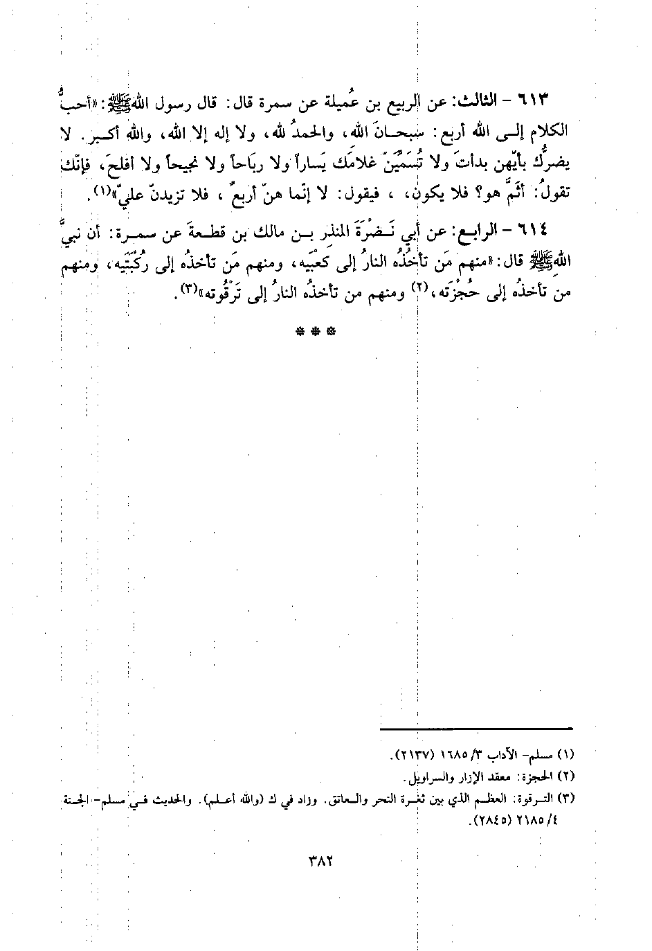 613 - الثَّالِث: عَن الرّبيع بن عميلة عَن سَمُرَة قَالَ: قَالَ رَسُول الله صلى الله عَلَيْهِ وَسلم: " أحب الْكَلَام إِلَى الله أَربع: سُبْحَانَ الله، وَالْحَمْد لله، وَلَا إِلَه إِلَّا الله، وَالله أكبر. لَا يَضرك بأيهن بدأت وَلَا تسمين غلامك يساراً وَلَا رباحاً وَلَا نجيحاً وَلَا أَفْلح، فَإنَّك تَقول: أَثم هُوَ؟ فَلَا يكون،، فَيَقُول: لَا إِنَّمَا هن أربعٌ، فَلَا تزيدن عَليّ ".