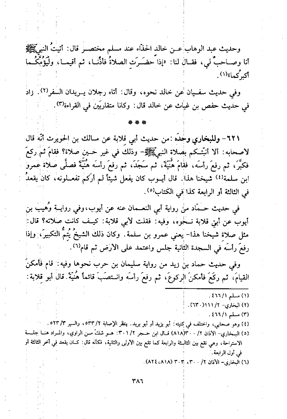 621 - وللبخاري وَحده: من حَدِيث أبي قلَابَة عَن مَالك بن الْحُوَيْرِث أَنه قَالَ لأَصْحَابه: أَلا أنبئكم بِصَلَاة النَّبِي صلى الله عَلَيْهِ وَسلم - وَذَلِكَ فِي غير حِين صَلَاة؟ فَقَامَ ثمَّ ركع فَكبر، ثمَّ رفع رَأسه، فَقَامَ هنيَّة، ثمَّ سجد، ثمَّ رفع رَأسه هنيَّة فصلى صَلَاة عَمْرو ابْن سَلمَة شَيخنَا هَذَا. قَالَ أَيُّوب كَانَ يفعل شَيْئا لم أركم تفعلونه، كَانَ يقْعد فِي الثَّالِثَة أَو الرَّابِعَة كَذَا فِي الْكتاب.