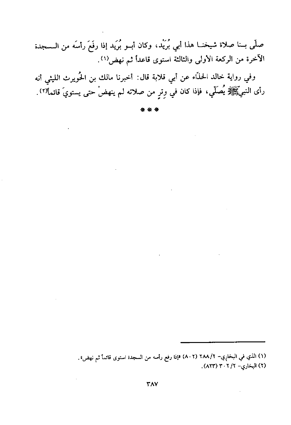وَفِي رِوَايَة خَالِد الْحذاء عَن أبي قلَابَة قَالَ: أخبرنَا مَالك بن الْحُوَيْرِث اللَّيْثِيّ أَنه رأى النَّبِي صلى الله عَلَيْهِ وَسلم يُصَلِّي، فَإِذا كَانَ فِي وترٍ من صلَاته لم ينْهض حَتَّى يَسْتَوِي قَائِما ".