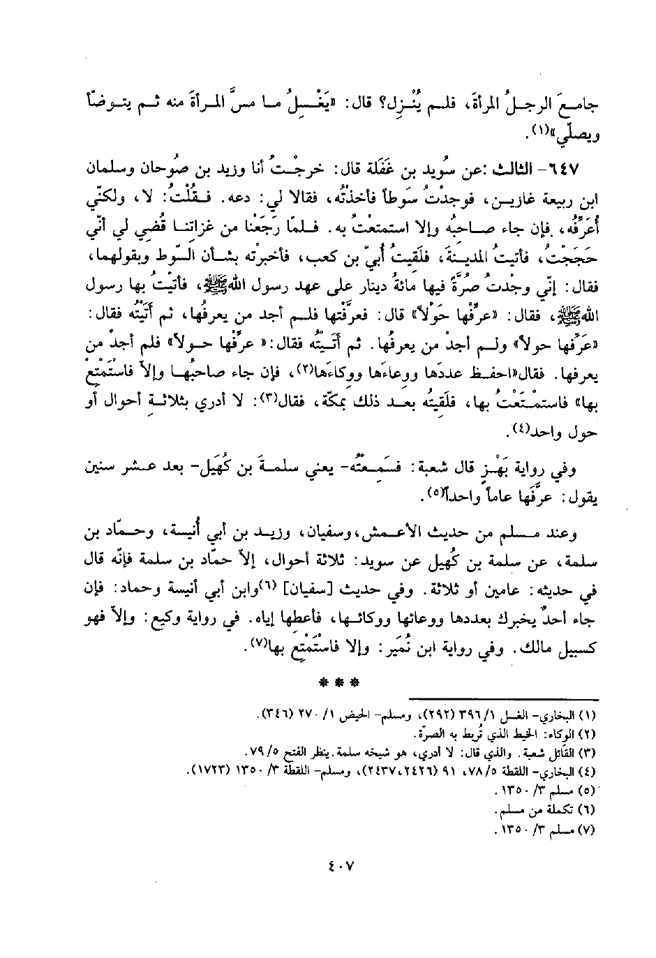 647 - الثَّالِث: عَن سُوَيْد بن غَفلَة قَالَ: خرجت أَنا وَزيد بن صوحان وسلمان ابْن ربيعَة غازين، فَوجدت سَوْطًا فَأَخَذته، فَقَالَا لي: دَعه. فَقلت: لَا، وَلَكِنِّي أعرفهُ، فَإِن جَاءَ صَاحبه وَإِلَّا استمتعت بِهِ. فَلَمَّا رَجعْنَا من غزاتنا قضي لي أَنِّي حججْت، فَأتيت الْمَدِينَة، فَلَقِيت أبي بن كَعْب، فَأَخْبَرته بشأن السَّوْط وبقولهما، فَقَالَ: إِنِّي وجدت صرةً فِيهَا مائَة دِينَار على عهد رَسُول الله صلى الله عَلَيْهِ وَسلم، فَأتيت بهَا رَسُول الله صلى الله عَلَيْهِ وَسلم، فَقَالَ: " عرفهَا حولا " قَالَ: فعرفتها فَلم أجد من يعرفهَا، ثمَّ أَتَيْته فَقَالَ: " عرفهَا حولا " وَلم أجد من يعرفهَا. ثمَّ أَتَيْته فَقَالَ: " عرفهَا حولا " فَلم أجد من يعرفهَا. فَقَالَ " احفظ عَددهَا ووعاءها ووكاءها، فَإِن جَاءَ صَاحبهَا وَإِلَّا فاستمتع بهَا " فاستمتعت بهَا، فَلَقِيته بعد ذَلِك بِمَكَّة، فَقَالَ: لَا أَدْرِي بِثَلَاثَة أَحْوَال أَو حول وَاحِد.