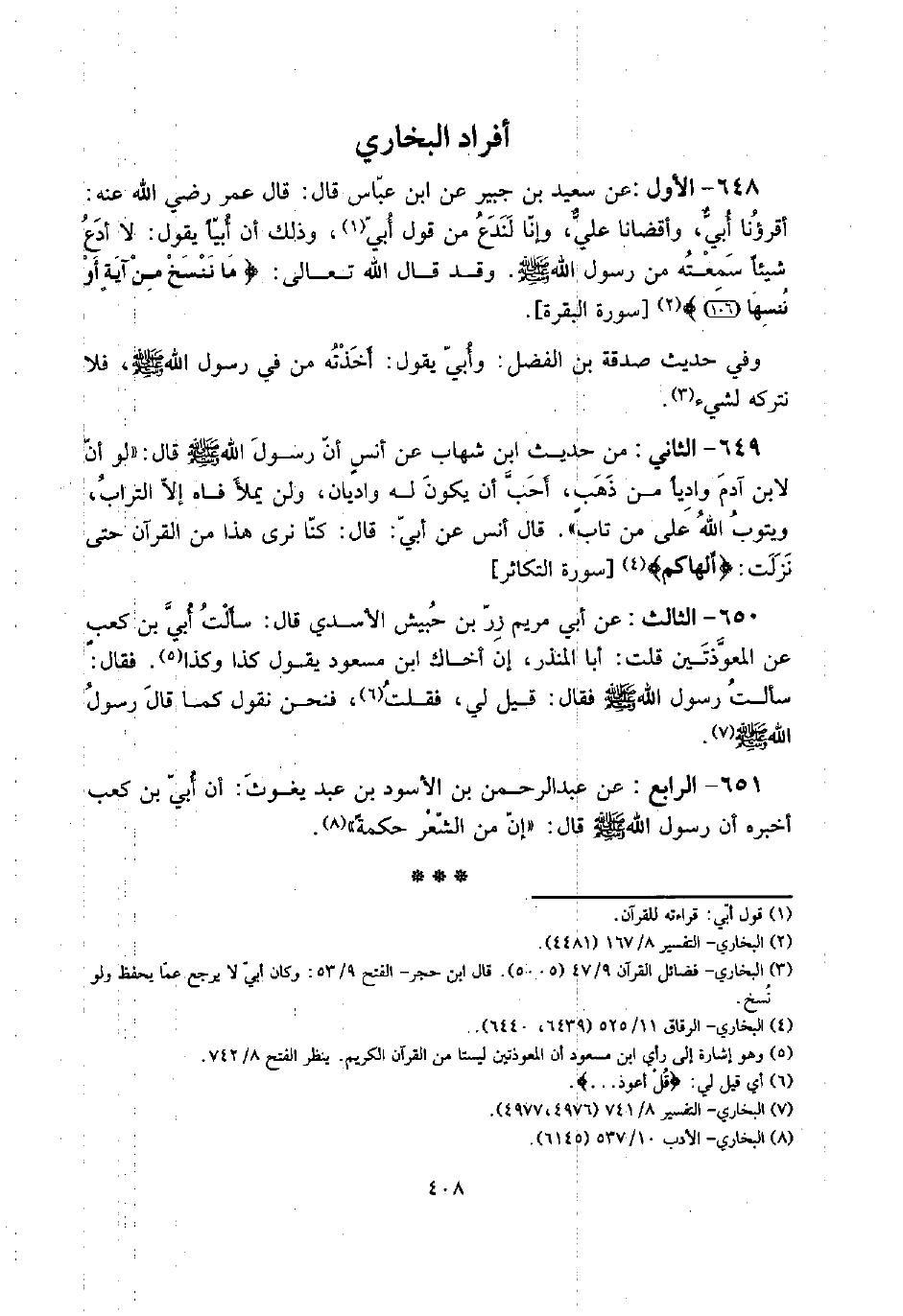 648 - الأول: عَن سعيد بن جُبَير عَن ابْن عَبَّاس قَالَ: قَالَ عمر رَضِي الله عَنهُ: أقرؤنا أبيٌّ، وأقضانا عليٌّ، وَإِنَّا لندع من قَول أبي، وَذَلِكَ أَن أبياًّ يَقُول: لَا أدع شَيْئا سمعته من رَسُول الله صلى الله عَلَيْهِ وَسلم. وَقد قَالَ الله تَعَالَى: {مَا ننسخ من آيَة أَو ننسها} [سُورَة الْبَقَرَة] .