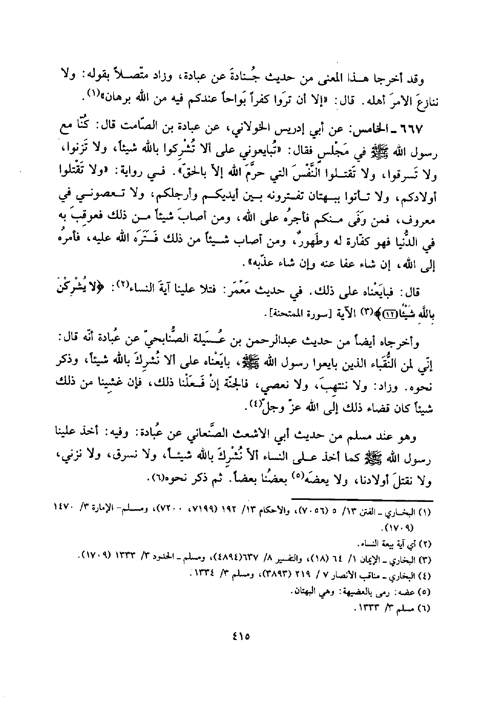 667 - الْخَامِس: عَن أبي إِدْرِيس الْخَولَانِيّ، عَن عبَادَة بن الصَّامِت قَالَ: كُنَّا مَعَ رَسُول الله صلى الله عَلَيْهِ وَسلم فِي مجلسٍ فَقَالَ: " تُبَايِعُونِي على أَلا تُشْرِكُوا بِاللَّه شَيْئا، وَلَا تَزْنُوا، وَلَا تَسْرِقُوا، وَلَا تقتلُوا النَّفس الَّتِي حرم الله إِلَّا بِالْحَقِّ ". فِي رِوَايَة: " وَلَا تقتلُوا أَوْلَادكُم، وَلَا تَأْتُوا بِبُهْتَان تفترونه بَين أَيْدِيكُم وأرجلكم، وَلَا تعصوني فِي مَعْرُوف، فَمن وفى مِنْكُم فَأَجره على الله، وَمن أصَاب شَيْئا من ذَلِك فَعُوقِبَ بِهِ فِي الدُّنْيَا فَهُوَ كَفَّارَة لَهُ وطهورٌ، وَمن أصَاب شَيْئا من ذَلِك فستره الله عَلَيْهِ، فَأمره إِلَى الله، إِن شَاءَ عَفا عَنهُ وَإِن شَاءَ عذبه ".