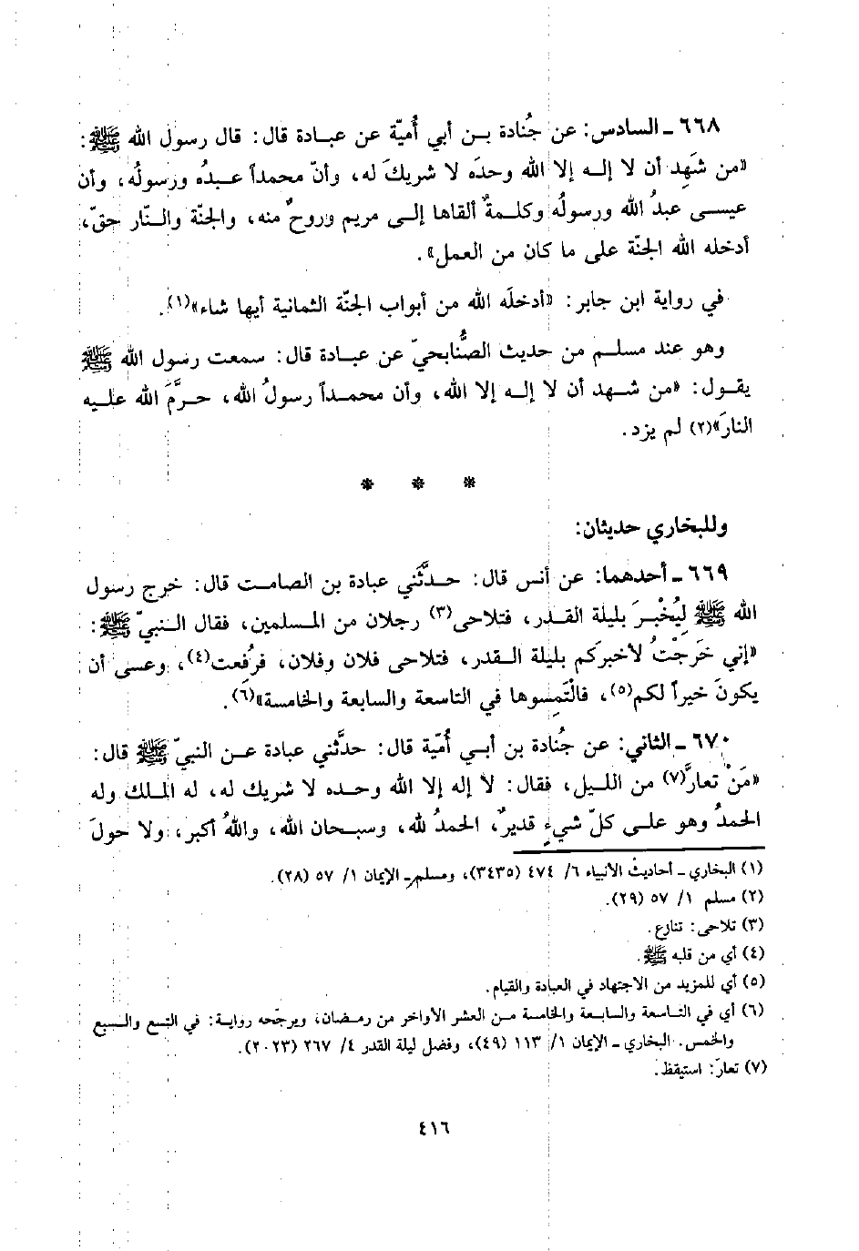 668 - السَّادِس: عَن جُنَادَة بن أبي أُميَّة عَن عبَادَة قَالَ: قَالَ رَسُول الله صلى الله عَلَيْهِ وَسلم: " من شهد أَن لَا إِلَه إِلَّا الله وَحده لَا شريك لَهُ، وَأَن مُحَمَّدًا عَبده وَرَسُوله، وَأَن عِيسَى عبد الله وَرَسُوله وكلمةٌ أَلْقَاهَا إِلَى مَرْيَم وروحٌ مِنْهُ، وَالْجنَّة وَالنَّار حق، أدخلهُ الله الْجنَّة على مَا كَانَ من الْعَمَل ".