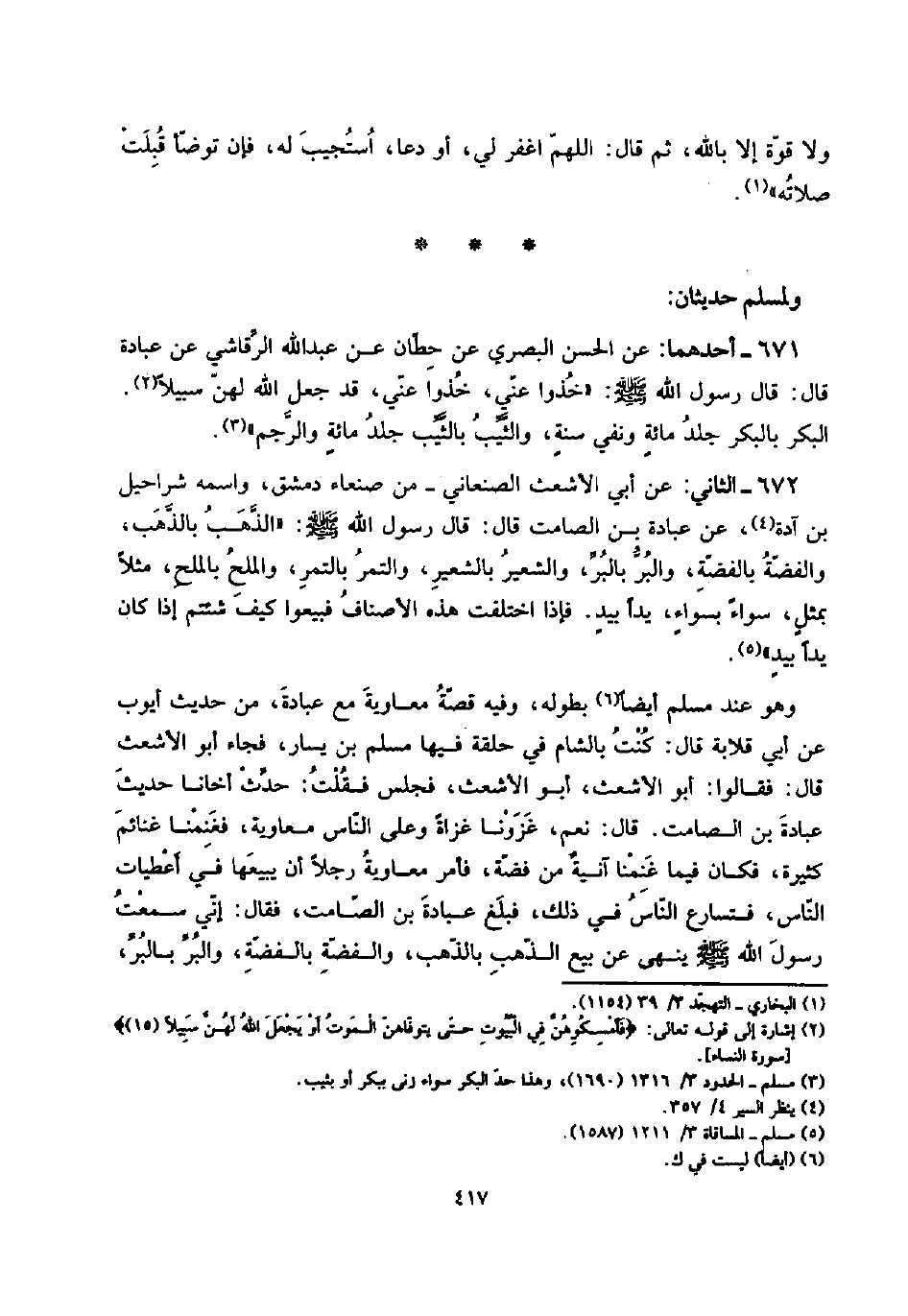 وَهُوَ عِنْد مُسلم أَيْضا بِطُولِهِ، وَفِيه قصَّة مُعَاوِيَة مَعَ عبَادَة، من حَدِيث أَيُّوب عَن أبي قلَابَة قَالَ: كنت بِالشَّام فِي حَلقَة فِيهَا مُسلم بن يسَار، فجَاء أَبُو الْأَشْعَث قَالَ: فَقَالُوا: أَبُو الْأَشْعَث، أَبُو الْأَشْعَث، فَجَلَسَ فَقلت: حدث أخانا حَدِيث عبَادَة بن الصَّامِت. قَالَ: نعم، غزونا غزَاة وعَلى النَّاس مُعَاوِيَة، فغنمنا غَنَائِم كَثِيرَة، فَكَانَ فِيمَا غنمنا آنيةٌ من فضَّة، فَأمر مُعَاوِيَة رجلا أَن يَبِيعهَا فِي أعطيات النَّاس، فَتسَارع النَّاس فِي ذَلِك، فَبلغ عبَادَة بن الصَّامِت، فَقَالَ:
