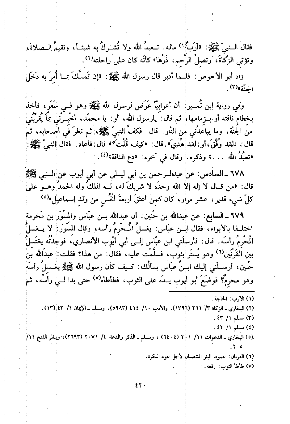 679 - السَّابِع: عَن عبد الله بن حنين: أَن عبد الله بن عَبَّاس والمسور بن مخرمَة اخْتلفَا بالأبواء، فَقَالَ ابْن عَبَّاس: يغسل الْمحرم رَأسه، وَقَالَ الْمسور: لَا يغسل الْمحرم رَأسه. قَالَ: فأرسلني ابْن عَبَّاس إِلَى أبي أَيُّوب الْأنْصَارِيّ، فَوَجَدته يغْتَسل بَين القرنين وَهُوَ يستر بِثَوْب، فَسلمت عَلَيْهِ، فَقَالَ: من هَذَا؟ فَقلت: عبد الله بن حنين، أَرْسلنِي إِلَيْك ابْن عَبَّاس يَسْأَلك: كَيفَ كَانَ رَسُول الله صلى الله عَلَيْهِ وَسلم يغسل رَأسه وَهُوَ محرمٌ؟ فَوضع أَبُو أَيُّوب يَده على الثَّوْب، فطأطأه حَتَّى بدا لي رَأسه، ثمَّ