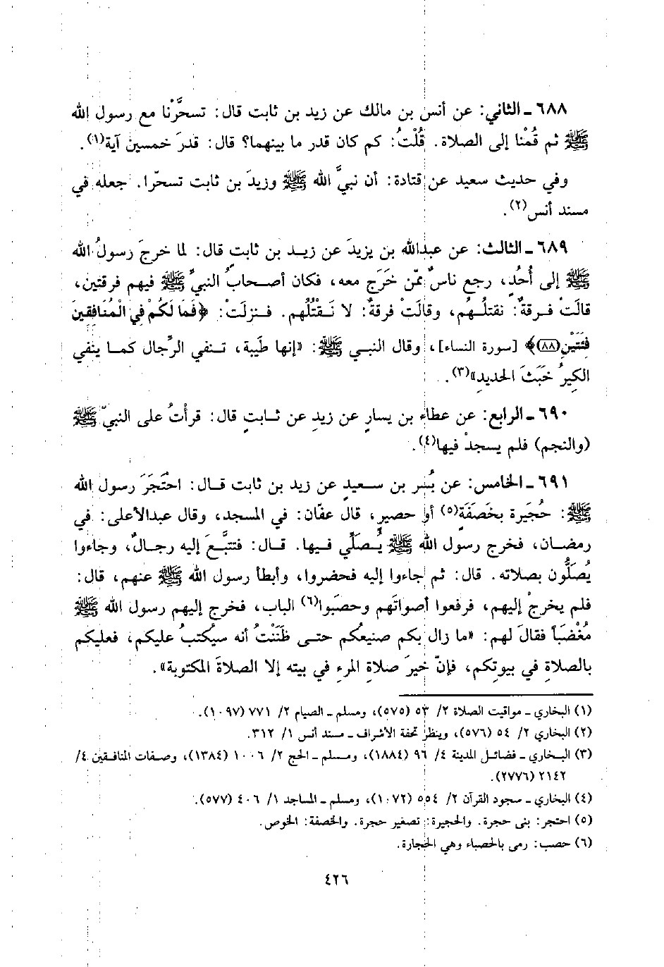 691 - الْخَامِس: عَن بسر بن سعيدٍ عَن زيد بن ثَابت قَالَ: احتجر رَسُول الله صلى الله عَلَيْهِ وَسلم: حجيرة بخصفةٍ أَو حصيرٍ، قَالَ عَفَّان: فِي الْمَسْجِد، وَقَالَ عبد الْأَعْلَى: فِي رَمَضَان، فَخرج رَسُول الله صلى الله عَلَيْهِ وَسلم يُصَلِّي فِيهَا: قَالَ: فتتبع إِلَيْهِ رجالٌ، وَجَاءُوا يصلونَ بِصَلَاتِهِ. قَالَ: ثمَّ جَاءُوا إِلَيْهِ فَحَضَرُوا، وَأَبْطَأ رَسُول الله صلى الله عَلَيْهِ وَسلم عَنْهُم، قَالَ: فَلم يخرج إِلَيْهِم، فَرفعُوا أَصْوَاتهم وحصبوا الْبَاب، فَخرج إِلَيْهِم رَسُول الله صلى الله عَلَيْهِ وَسلم مغضباً فَقَالَ لَهُم: " مَا زَالَ بكم صنيعكم حَتَّى ظَنَنْت أَنه سيكتب عَلَيْكُم، فَعَلَيْكُم بِالصَّلَاةِ فِي بُيُوتكُمْ، فَإِن خير صَلَاة الْمَرْء فِي بَيته إِلَّا الصَّلَاة الْمَكْتُوبَة ".