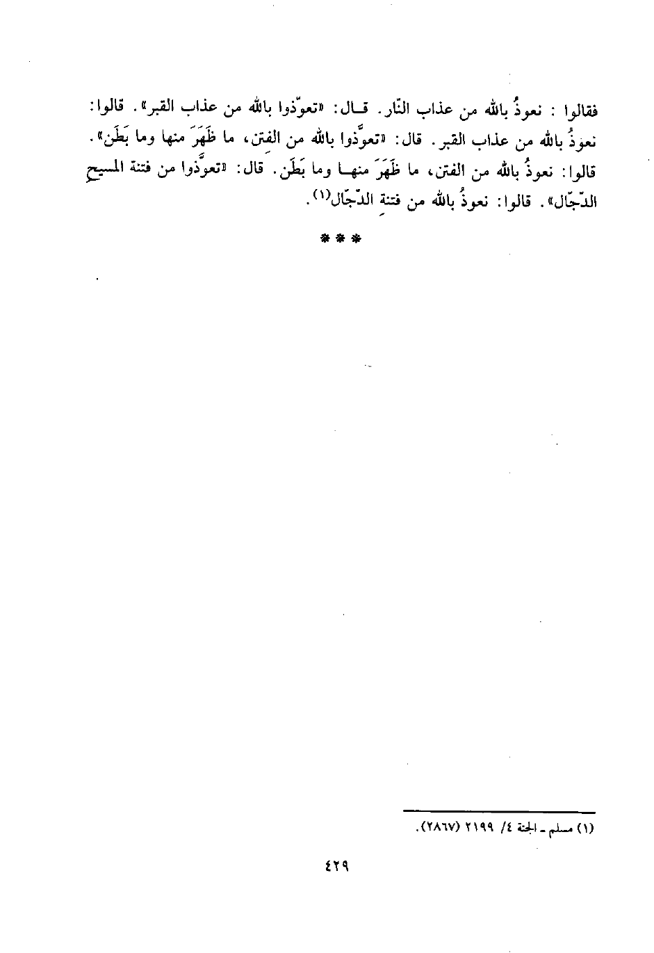 فَقَالُوا: نَعُوذ بِاللَّه من عَذَاب النَّار. قَالَ: " تعوذوا بِاللَّه من عَذَاب الْقَبْر ". قَالُوا: نَعُوذ بِاللَّه من عَذَاب الْقَبْر. قَالَ: " تعوذوا بِاللَّه من الْفِتَن، مَا ظهر مِنْهَا وَمَا بطن ".