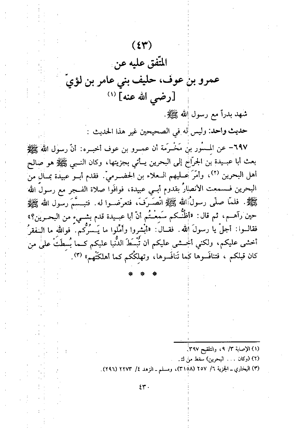 (43) الْمُتَّفق عَلَيْهِ عَن عَمْرو بن عَوْف، حَلِيف بني عَامر بن لؤَي [رَضِي الله عَنهُ]
