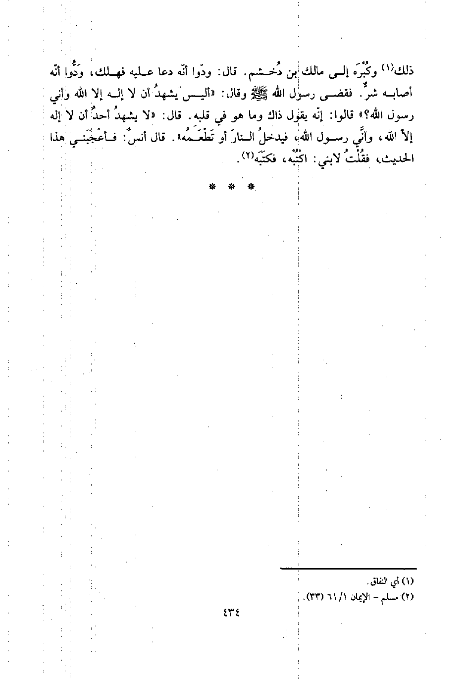 ذَلِك وَكبره إِلَى مَالك بن دخشم. قَالَ: ودوا أَنه دَعَا عَلَيْهِ فَهَلَك، ودوا أَنه أَصَابَهُ شرٌّ. فَقضى رَسُول الله صلى الله عَلَيْهِ وَسلم وَقَالَ: " أَلَيْسَ يشْهد أَن لَا إِلَه إِلَّا الله وَأَنِّي رَسُول الله؟ " قَالُوا: إِنَّه يَقُول ذَاك وَمَا هُوَ فِي قلبه. قَالَ: " لَا يشْهد أحدٌ أَن لَا إِلَه إِلَّا الله، وَأَنِّي رَسُول الله، فَيدْخل النَّار أَو تطعمه ". قَالَ أنسٌ: فَأَعْجَبَنِي هَذَا الحَدِيث، فَقلت لِابْني: اكتبه، فَكَتبهُ.