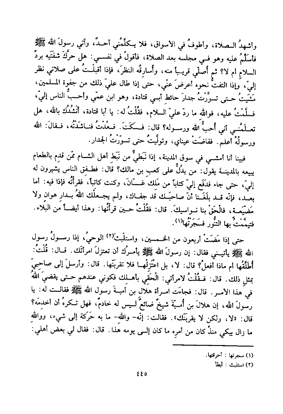 وَأشْهد الصَّلَاة، وأطوف فِي الْأَسْوَاق، فَلَا يكلمني أحدٌ، وَآتِي رَسُول الله صلى الله عَلَيْهِ وَسلم فَأسلم عَلَيْهِ وَهُوَ فِي مَجْلِسه بعد الصَّلَاة، فَأَقُول فِي نَفسِي: هَل حرك شَفَتَيْه برد السَّلَام أم لَا؟ ثمَّ أُصَلِّي قَرِيبا مِنْهُ، وأسارقه النّظر، فَإِذا أَقبلت على صَلَاتي نظر إِلَيّ، وَإِذا الْتفت نَحوه أعرض عني، حَتَّى إِذا طَال عَليّ ذَلِك من جفوة الْمُسلمين، مشيت حَتَّى تسورت جِدَار حَائِط أبي قَتَادَة، وَهُوَ ابْن عمي واحب النَّاس إِلَيّ، فَسلمت عَلَيْهِ، فوَاللَّه مَا رد عَليّ السَّلَام، فَقلت لَهُ: يَا أَبَا قَتَادَة، أنْشدك بِاللَّه، هَل تعلمني أَنِّي أحب الله وَرَسُوله؟ قَالَ: فَسكت. فعدت فناشدته، فَقَالَ: الله وَرَسُوله أعلم. فَفَاضَتْ عيناني، وتوليت حَتَّى تسورت الْجِدَار.