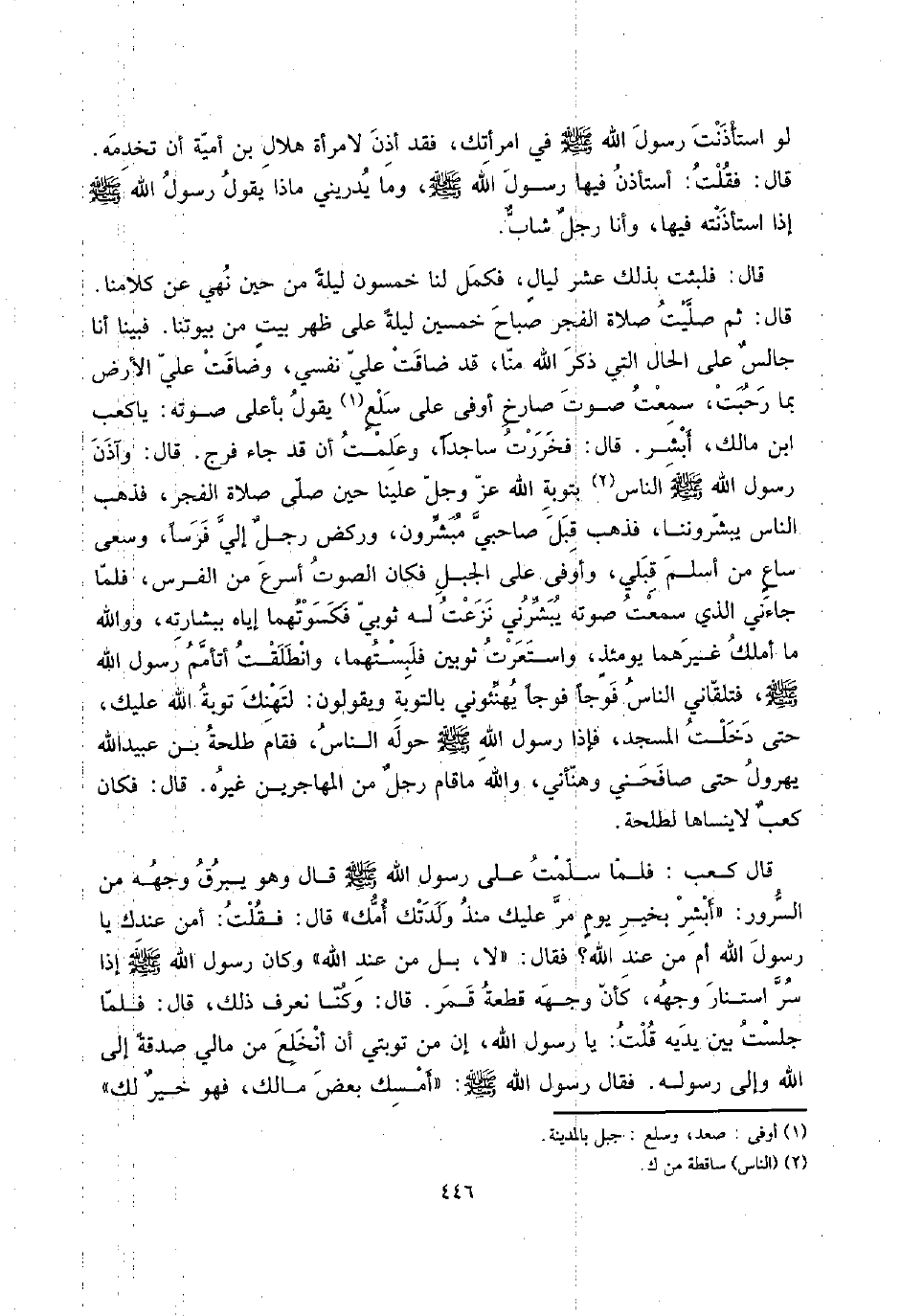 قَالَ: ثمَّ صليت صَلَاة الْفجْر صباح خمسين لَيْلَة على ظهر بيتٍ من بُيُوتنَا. فَبينا أَنا جالسٌ على الْحَال الَّتِي ذكر الله منا، قد ضَاقَتْ عَليّ نَفسِي، وَضَاقَتْ عَليّ الأَرْض بِمَا رَحبَتْ، سَمِعت صَوت صارخ أَو فى على سلعٍ يَقُول بِأَعْلَى صَوته: يَا كَعْب ابْن مَالك، أبشر. قَالَ: فَخَرَرْت سَاجِدا، وَعلمت أَن قد جَاءَ فرج. قَالَ: وآذن رَسُول الله صلى الله عَلَيْهِ وَسلم النَّاس بتوبة الله عز وَجل علينا حِين صلى صَلَاة الْفجْر، فَذهب النَّاس يبشروننا، فَذهب قبل صَاحِبي مبشرون، وركض رجلٌ إِلَيّ فرسا، وسعى ساعٍ من أسلم قبلي، وأوفى على الْجَبَل فَكَانَ الصَّوْت أسْرع من الْفرس، فَلَمَّا جَاءَنِي الَّذِي سَمِعت صَوته يبشرني نزعت لَهُ ثوبي فكسوتهما إِيَّاه ببشارته، وَوَاللَّه مَا أملك غَيرهمَا يومئذٍ، واستعرت ثَوْبَيْنِ فلبستهما، وَانْطَلَقت أتأمم رَسُول الله صلى الله عَلَيْهِ وَسلم، فتلقاني النَّاس فوجاً فوجاً يهنئوني بِالتَّوْبَةِ وَيَقُولُونَ: لتهنك تَوْبَة الله عَلَيْك، حَتَّى دخلت الْمَسْجِد، فَإِذا رَسُول الله صلى الله عَلَيْهِ وَسلم حوله النَّاس، فَقَامَ طَلْحَة بن عبيد الله يُهَرْوِل حَتَّى صَافَحَنِي وَهَنأَنِي، وَالله مَا قَامَ رجلٌ من الْمُهَاجِرين غَيره. قَالَ: فَكَانَ كعبٌ لَا ينساها لطلْحَة.