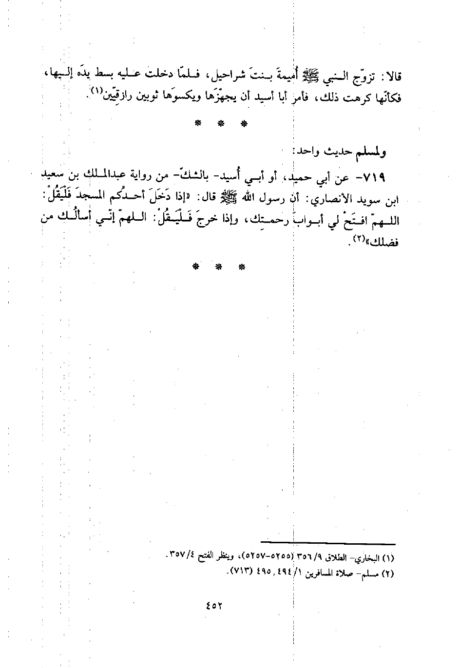 719 - عَن أبي حميد، أَو أبي أسيد - بِالشَّكِّ - من رِوَايَة عبد الْملك بن سعيد ابْن سُوَيْد الْأنْصَارِيّ: أَن رَسُول الله صلى الله عَلَيْهِ وَسلم قَالَ: " إِذا دخل أحدكُم الْمَسْجِد فَلْيقل: اللَّهُمَّ افْتَحْ لي أَبْوَاب رحمتك، وَإِذا خرج فَلْيقل: اللَّهُمَّ إِنِّي أَسأَلك من فضلك ".