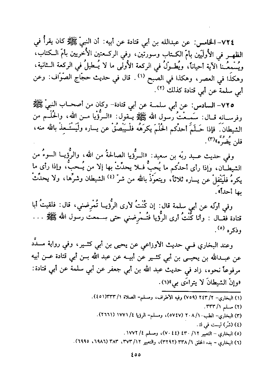 725 - السَّادِس: عَن أبي سَلمَة عَن أبي قَتَادَة - وَكَانَ من أَصْحَاب النَّبِي صلى الله عَلَيْهِ وَسلم وفرسانه قَالَ: سَمِعت رَسُول الله صلى الله عَلَيْهِ وَسلم يَقُول: " الرُّؤْيَا من الله، والحلم من الشَّيْطَان. فَإِذا حلم أحدكُم الْحلم يكرههُ فليبصق عَن يسَاره وليستعذ بِاللَّه مِنْهُ، فَلَنْ يضرّهُ ".