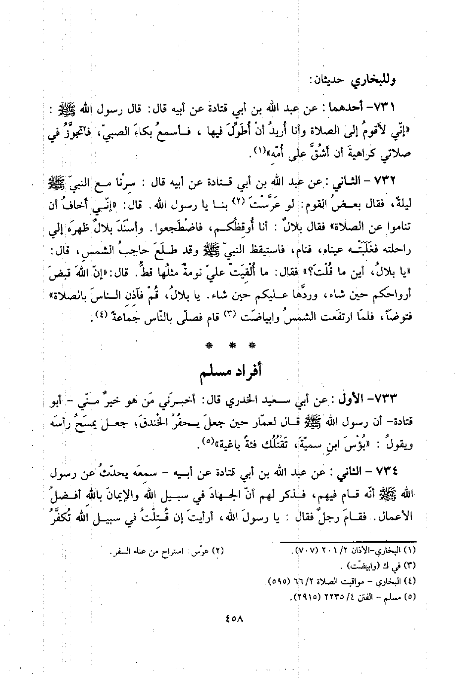 732 - الثَّانِي: عَن عبد الله بن أبي قَتَادَة عَن أَبِيه قَالَ: سرنا مَعَ النَّبِي صلى الله عَلَيْهِ وَسلم لَيْلَة، فَقَالَ بعض الْقَوْم: لَو عرست بِنَا يَا رَسُول الله. قَالَ: " إِنِّي أَخَاف أَن تناموا عَن الصَّلَاة " فَقَالَ بلالٌ: أَنا أوقظكم، فاضطجعوا. وَأسْندَ بلالٌ ظَهره إِلَيّ رَاحِلَته فغلبته عَيناهُ، فَنَامَ، فَاسْتَيْقَظَ النَّبِي صلى الله عَلَيْهِ وَسلم وَقد طلع حَاجِب الشَّمْس، قَالَ: " يَا بِلَال، أَيْن مَا قلت؟ " فَقَالَ: مَا ألقيت عَليّ نومةٌ مثلهَا قطّ. قَالَ: " إِن الله قبض أرواحكم حِين شَاءَ، وردهَا عَلَيْكُم حِين شَاءَ. يَا بِلَال، قُم فآذن النَّاس بِالصَّلَاةِ " فَتَوَضَّأ، فَلَمَّا ارْتَفَعت الشَّمْس وابياضت قَامَ فصلى بِالنَّاسِ جمَاعَة.