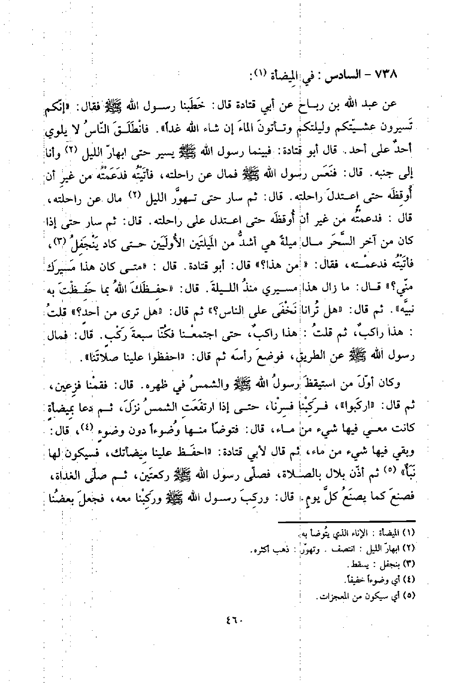 738 - السَّادِس: فِي الميضأة. عَن عبد الله بن رَبَاح عَن أبي قَتَادَة قَالَ: خَطَبنَا رَسُول الله صلى الله عَلَيْهِ وَسلم فَقَالَ: " إِنَّكُم تسيرون عشيتكم وليلتكم وتأتون المَاء إِن شَاءَ الله غَدا ". فَانْطَلق النَّاس لَا يلوي أحدٌ على أحد. قَالَ أَبُو قَتَادَة: فَبَيْنَمَا رَسُول الله صلى الله عَلَيْهِ وَسلم يسير حَتَّى ابهار اللَّيْل وَأَنا إِلَى جنبه. قَالَ: فنعس رَسُول الله صلى الله عَلَيْهِ وَسلم فَمَال عَن رَاحِلَته، فَأَتَيْته فدعمته من غير أَن أوقظه حَتَّى اعتدل رَاحِلَته. قَالَ: ثمَّ سَار حَتَّى تهور اللَّيْل مَال عَن رَاحِلَته، قَالَ: فدعمته من غير أَن أوقظه حَتَّى اعتدل على رَاحِلَته. قَالَ: ثمَّ سَار حَتَّى إِذا كَانَ من آخر السحر مَال مَيْلَة هِيَ أَشد من الميلتين الْأَوليين حَتَّى كَاد ينجفل، فَأَتَيْته فدعمته، فَقَالَ: " من هَذَا؟ " قَالَ: أَبُو قَتَادَة. قَالَ: " مَتى كَانَ هَذَا مسيرك مني؟ " قَالَ: مَا زَالَ هَذَا مسيري مُنْذُ اللَّيْلَة. قَالَ: " حفظك الله بِمَا حفظت بِهِ نبيه ". ثمَّ قَالَ: " هَل تَرَانَا نخفى على النَّاس؟ " ثمَّ قَالَ: " هَل ترى من أحدٍ؟ " قلت: هَذَا راكبٌ، ثمَّ قلت: هَذَا راكبٌ، حَتَّى اجْتَمَعنَا فَكُنَّا سَبْعَة ركبٍ. قَالَ: فَمَال رَسُول الله صلى الله عَلَيْهِ وَسلم عَن الطَّرِيق، فَوضع رَأسه ثمَّ قَالَ: " احْفَظُوا علينا صَلَاتنَا ".