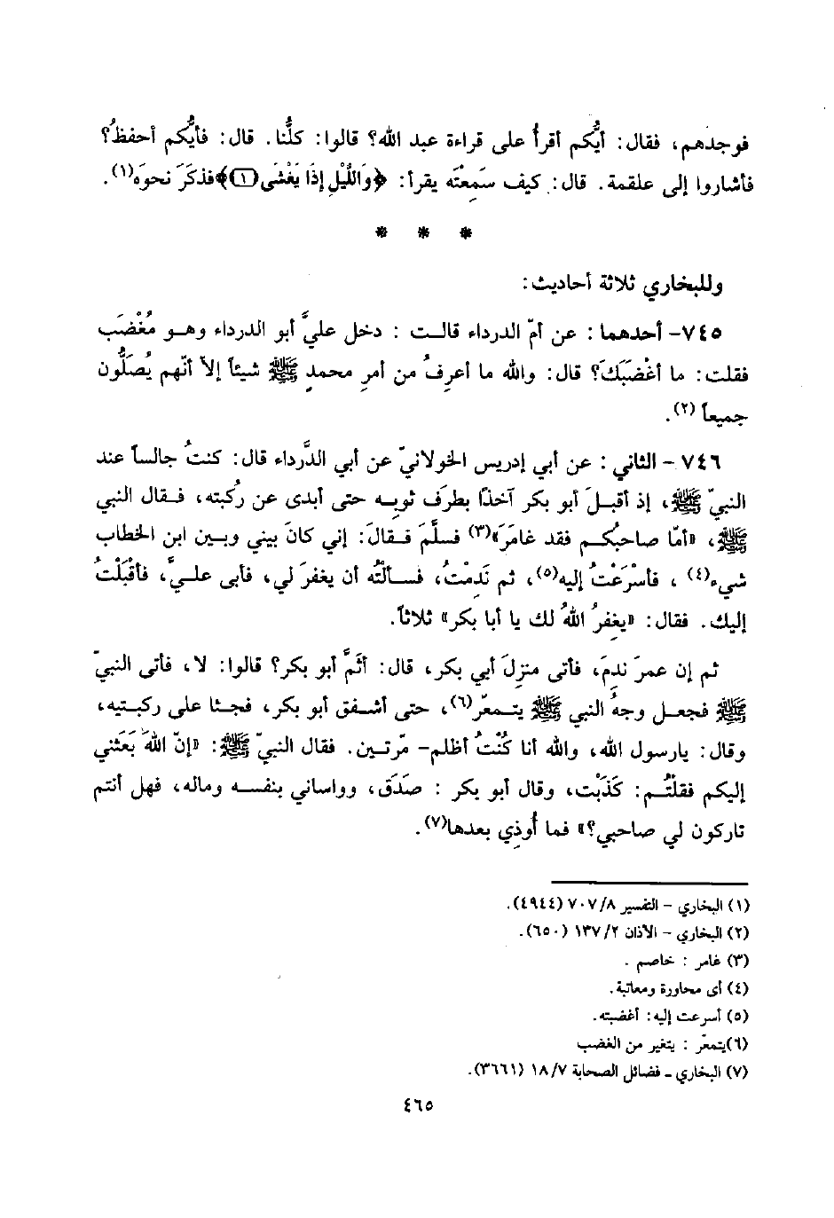 746 - الثَّانِي: عَن أبي إِدْرِيس الْخَولَانِيّ عَن أبي الدَّرْدَاء قَالَ: كنت جَالِسا عِنْد النَّبِي صلى الله عَلَيْهِ وَسلم، إِذْ أقبل أَبُو بكر آخِذا بِطرف ثَوْبه حَتَّى أبدى عَن ركبته، فَقَالَ النَّبِي صلى الله عَلَيْهِ وَسلم، " أما صَاحبكُم فقد غامر " فَسلم فَقَالَ: إِنِّي كَانَ بيني وَبَين ابْن الْخطاب شَيْء، فأسرعت إِلَيْهِ، ثمَّ نَدِمت، فَسَأَلته أَن يغْفر لي، فَأبى عَليّ، فَأَقْبَلت إِلَيْك. فَقَالَ: " يغْفر الله لَك يَا أَبَا بكر " ثَلَاثًا.