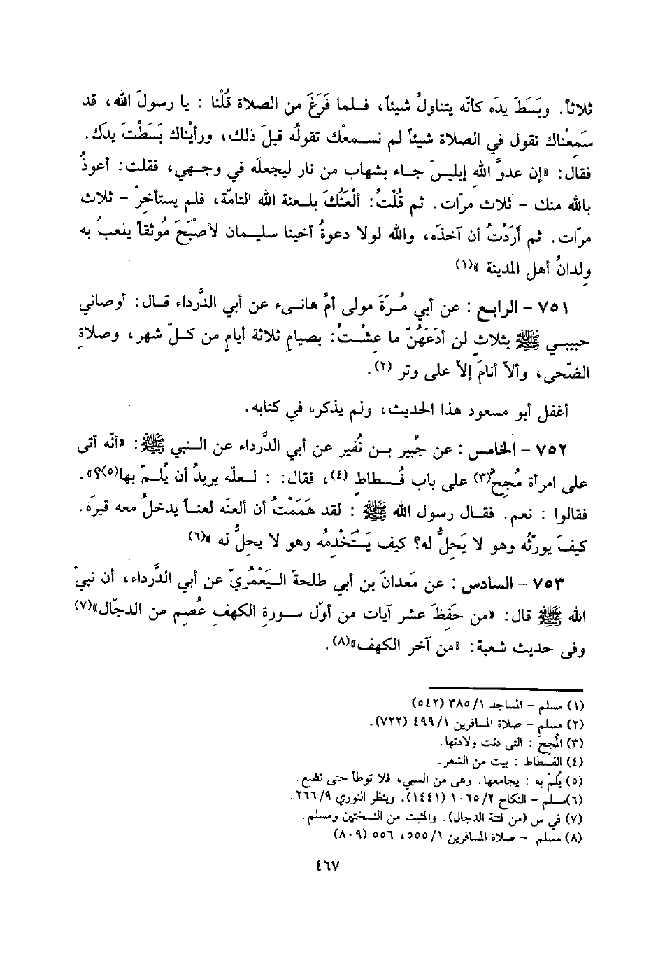 فَقَالَ: " إِن عَدو الله إِبْلِيس جَاءَ بشهاب من نَار ليجعله فِي وَجْهي، فَقلت: أعوذ بِاللَّه مِنْك - ثَلَاث مَرَّات. ثمَّ قلت: ألعنك بلعنة الله التَّامَّة، فَلم يسْتَأْخر - ثَلَاث مَرَّات. ثمَّ أردْت أَن آخذه، وَالله لَوْلَا دَعْوَة أخينا سُلَيْمَان لأصبح موثقًا يلْعَب بِهِ ولدان أهل الْمَدِينَة ". 751 - الرَّابِع: عَن أبي مرّة مولى أم هَانِئ عَن أبي الدَّرْدَاء قَالَ: أَوْصَانِي حَبِيبِي صلى الله عَلَيْهِ وَسلم بثلاثٍ لن أدعهن مَا عِشْت: بصيام ثَلَاثَة أيامٍ من كل شهر، وَصَلَاة الضُّحَى، وَألا أَنَام إِلَّا على وتر.