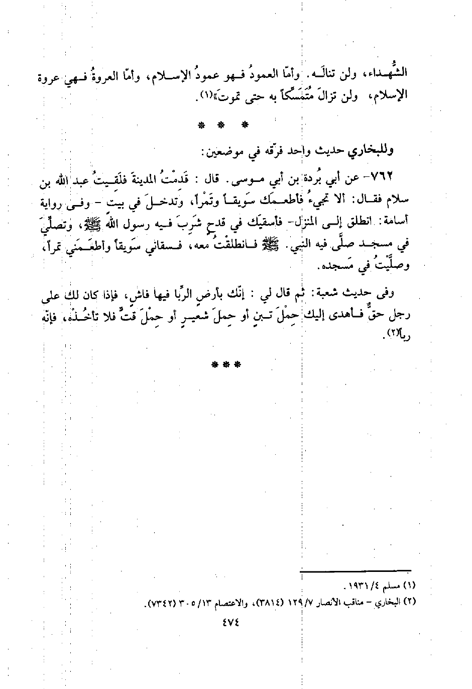 762 - عَن أبي بردة بن أبي مُوسَى. قَالَ: قدمت الْمَدِينَة فَلَقِيت عبد الله بن سَلام فَقَالَ: أَلا تَجِيء فأطعمك سويقاً وَتَمْرًا، وَتدْخل فِي بيتٍ - وَفِي رِوَايَة أُسَامَة: انْطلق إِلَى الْمنزل - فأسقيك فِي قدحٍ شرب فِيهِ رَسُول الله صلى الله عَلَيْهِ وَسلم، وَتصلي فِي مَسْجِد صلى فِيهِ النَّبِي. صلى الله عَلَيْهِ وَسلم فَانْطَلَقت مَعَه، فسقاني سويقاً وأطعمني تَمرا، وَصليت فِي مَسْجده.