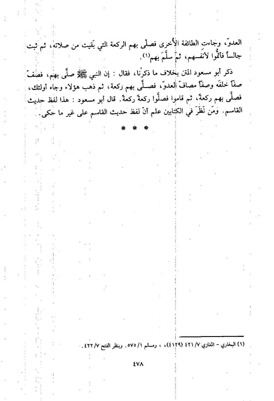 إِن النَّبِي صلى الله عَلَيْهِ وَسلم صلى بهم، فَصف صفاًّ خَلفه وصفاًّ مصَاف الْعَدو، فصلى بهم رَكْعَة، ثمَّ ذهب هَؤُلَاءِ وَجَاء أُولَئِكَ، فصلى بهم رَكْعَة، ثمَّ قَامُوا فصلوا رَكْعَة رَكْعَة. قَالَ أَبُو مَسْعُود: هَذَا لفظ حَدِيث الْقَاسِم. وَمن نظر فِي الْكِتَابَيْنِ علم أَن لفظ حَدِيث الْقَاسِم على غير مَا حكى.