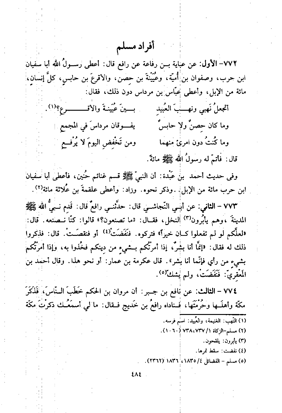 772 - الأول: عَن عَبَايَة بن رِفَاعَة عَن رَافع قَالَ: أعْطى رَسُول الله أَبَا سُفْيَان ابْن حَرْب، وَصَفوَان بن أُميَّة، وعيينة بن حصن، والأقرع بن حابسٍ، كل إنسانٍ، مائَة من الْإِبِل، وَأعْطى عَبَّاس بن مرداس دون ذَلِك، فَقَالَ: