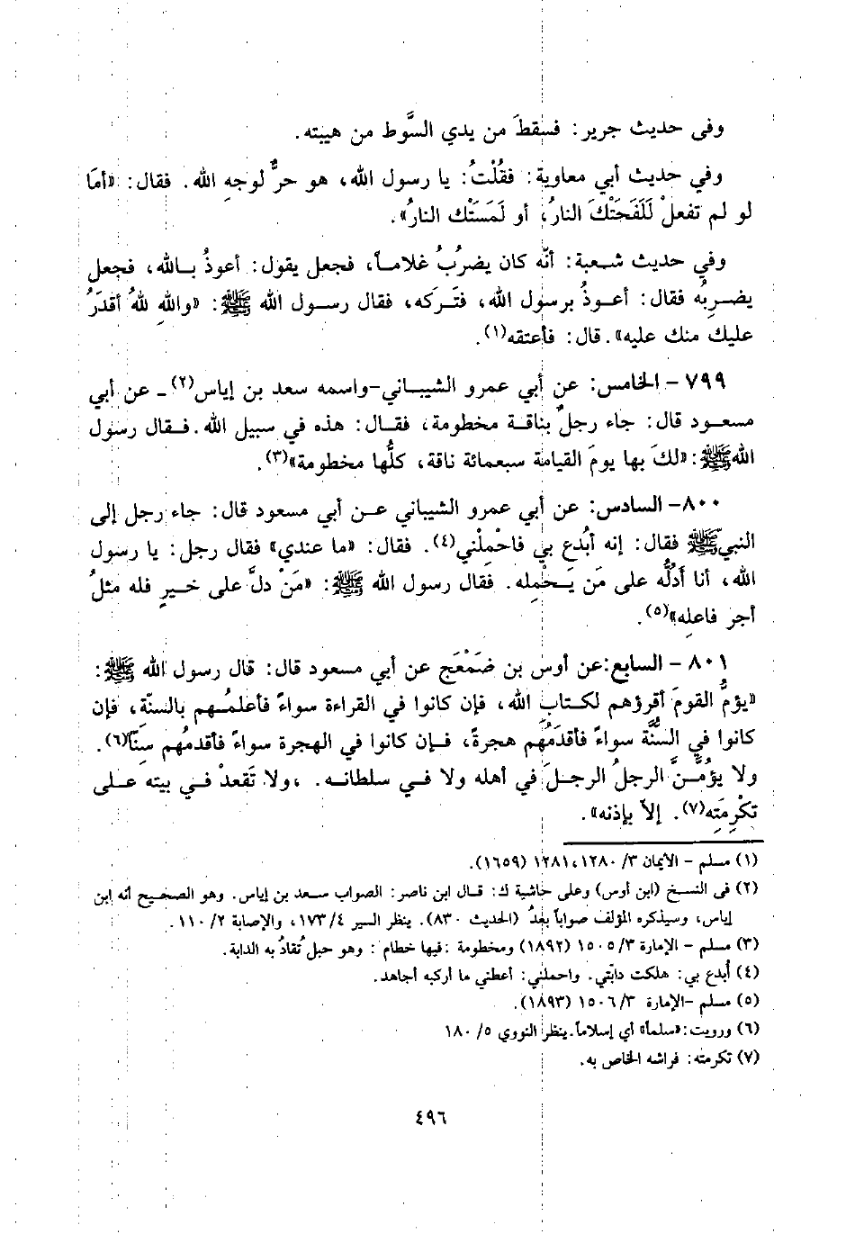 799 - الْخَامِس: عَن أبي عَمْرو الشَّيْبَانِيّ - واسْمه سعد بن إِيَاس - عَن أبي مَسْعُود قَالَ: جَاءَ رجلٌ بِنَاقَة مخطومة، فَقَالَ: هَذِه فِي سَبِيل الله. فَقَالَ رَسُول الله صلى الله عَلَيْهِ وَسلم: " لَك بهَا يَوْم الْقِيَامَة سَبْعمِائة نَاقَة، كلهَا مخطومة ".