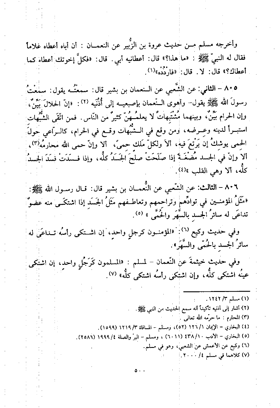 805 - الثَّانِي: عَن الشّعبِيّ عَن النُّعْمَان بن بشير قَالَ: سمعته يَقُول: سَمِعت رَسُول الله صلى الله عَلَيْهِ وَسلم يَقُول - وأهوى النُّعْمَان بإصبعيه إِلَى أُذُنَيْهِ: " إِن الْحَلَال بينٌ، وَإِن الْحَرَام بينٌ، وَبَينهمَا مشتبهاتٌ لَا يعلمهُنَّ كثيرٌ من النَّاس. فَمن اتَّقى الشُّبُهَات اسْتَبْرَأَ لدينِهِ وَعرضه، وَمن وَقع فِي الشُّبُهَات وَقع فِي الْحَرَام، كَالرَّاعِي حول الْحمى يُوشك إِن يرتع فِيهِ، أَلا وَلكُل ملك حمى، أَلا وَإِن حمى الله مَحَارمه، أَلا وَإِن فِي الْجَسَد مُضْغَة إِذا صلحت صلح الْجَسَد كُله، وَإِذا فَسدتْ فسد الْجَسَد كُله، أَلا وَهِي الْقلب ".