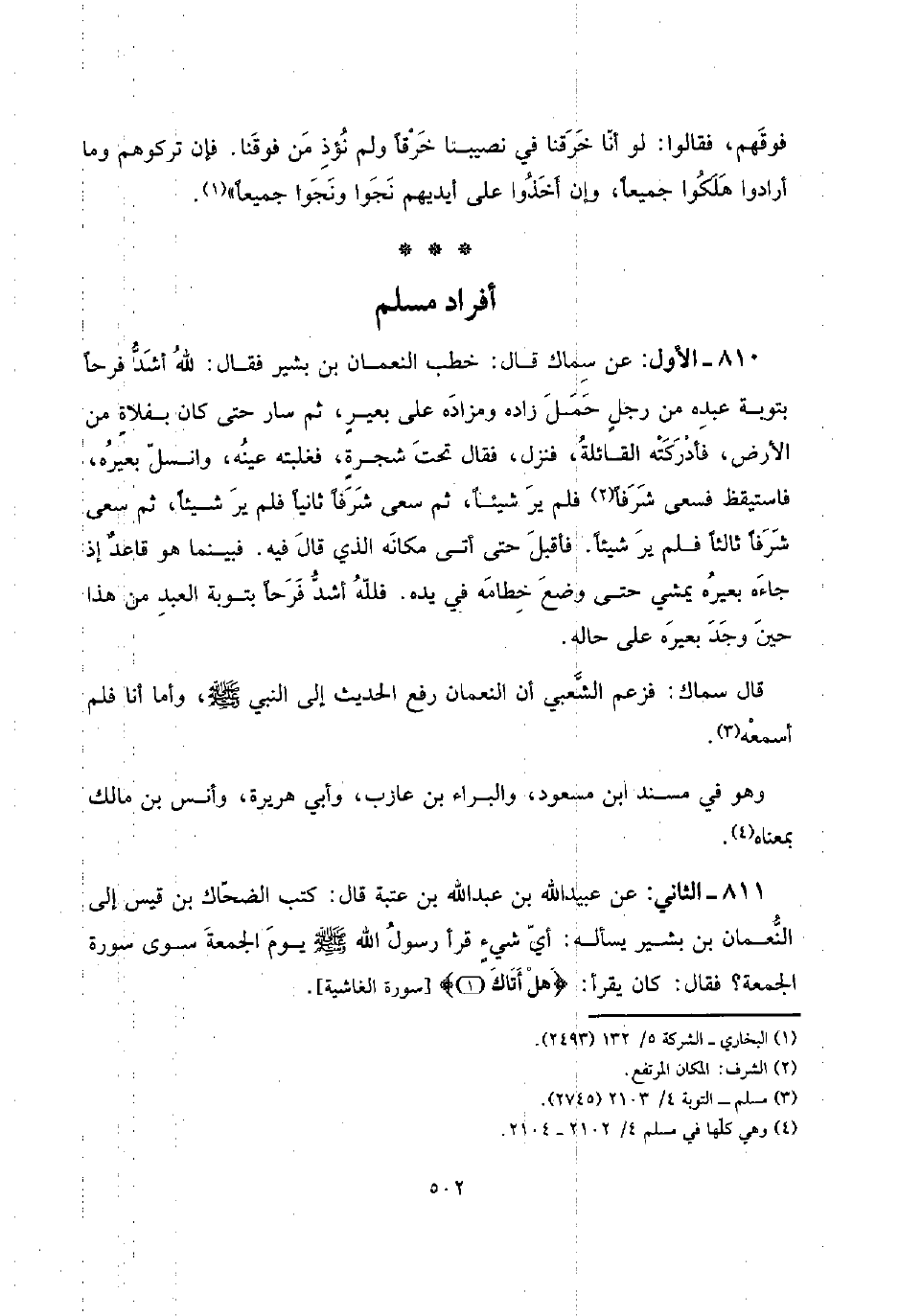 810 - الأول: عَن سماك قَالَ: خطب النُّعْمَان بن بشير فَقَالَ: لله أَشد فَرحا بتوبة عَبده من رجلٍ حمل زَاده ومزاده على بعيرٍ، ثمَّ سَار حَتَّى كَانَ بفلاةٍ من الأَرْض، فَأَدْرَكته القائلة، فَنزل، فَقَالَ تَحت شجرةٍ، فغلبته عينه، وانسل بعيره، فَاسْتَيْقَظَ فسعى شرفاً فَلم ير شَيْئا، ثمَّ سعى شرفاً ثَانِيًا فَلم ير شَيْئا، ثمَّ سعى شرفاً ثَالِثا فَلم ير شَيْئا. فَأقبل حَتَّى أَتَى مَكَانَهُ الَّذِي قَالَ فِيهِ. فَبَيْنَمَا هُوَ قاعدٌ إِذْ جَاءَهُ بعيره يمشي حَتَّى وضع خطامه فِي يَده. فَللَّه أَشد فَرحا بتوبة العَبْد من هَذَا حِين وجد بعيره على حَاله.