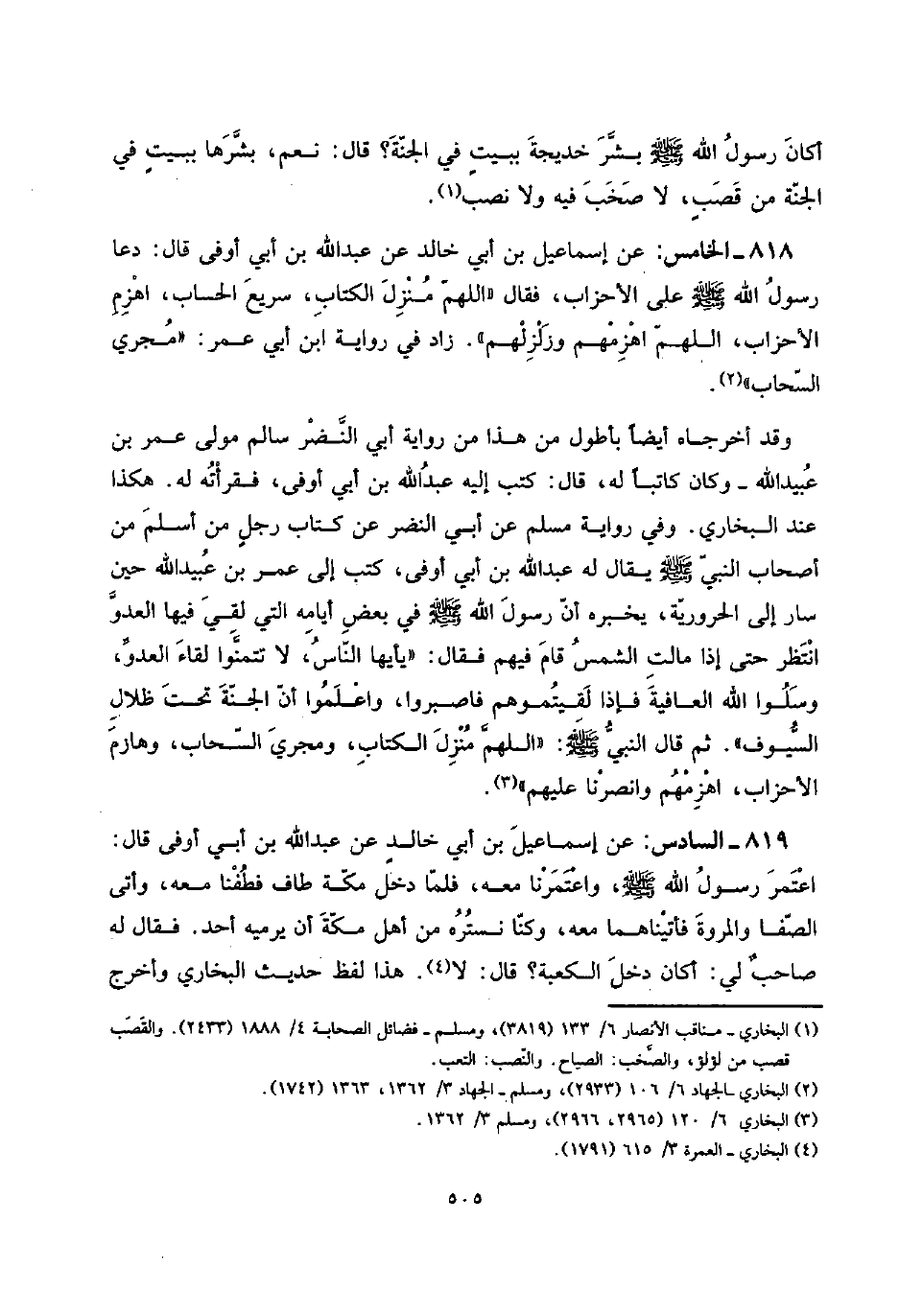 818 - الْخَامِس: عَن إِسْمَاعِيل بن أبي خَالِد عَن عبد الله بن أبي أوفى قَالَ: دَعَا رَسُول الله صلى الله عَلَيْهِ وَسلم على الْأَحْزَاب، فَقَالَ: " اللَّهُمَّ منزل الْكتاب، سريع الْحساب، اهزم الْأَحْزَاب، اللَّهُمَّ اهزمهم وزلزلهم ". زَاد فِي رِوَايَة ابْن أبي عمر: " مجري السَّحَاب ".
