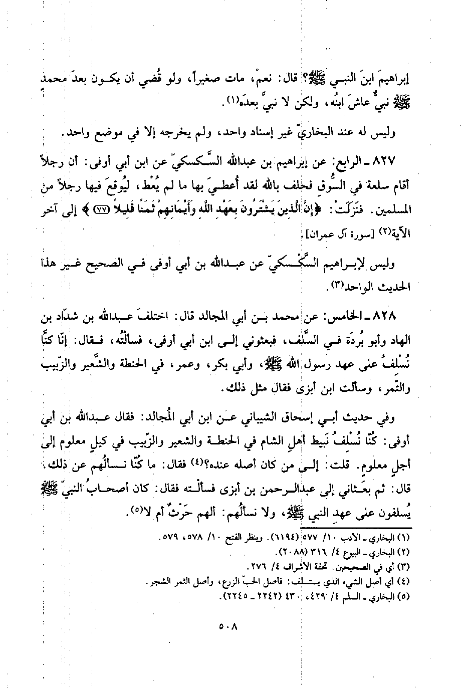 828 - الْخَامِس: عَن مُحَمَّد بن أبي المجالد قَالَ: اخْتلف عبد الله بن شَدَّاد بن الْهَاد وَأَبُو بردة فِي السّلف، فبعثوني إِلَى ابْن أبي أوفى، فَسَأَلته، فَقَالَ: إِنَّا كُنَّا نُسلف على عهد رَسُول الله صلى الله عَلَيْهِ وَسلم، وَأبي بكر، وَعمر، فِي الْحِنْطَة وَالشعِير وَالزَّبِيب وَالتَّمْر، وَسَأَلت ابْن أَبْزَى فَقَالَ مثل ذَلِك.