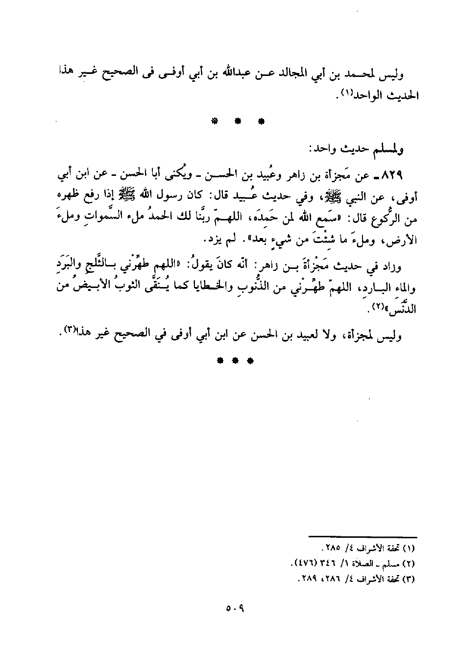 829 - عَن مجزأَة بن زَاهِر وَعبيد بن الْحسن - ويكنى أَبَا الْحسن - عَن ابْن أبي أوفى، عَن النَّبِي صلى الله عَلَيْهِ وَسلم، وَفِي حَدِيث عبيد قَالَ: كَانَ رَسُول الله صلى الله عَلَيْهِ وَسلم إِذا رفع ظَهره من الرُّكُوع قَالَ: " سمع الله لمن حَمده، اللَّهُمَّ رَبنَا لَك الْحَمد ملْء السَّمَوَات وملء الأَرْض، وملء مَا شِئْت من شيءٍ بعد ". لم يزدْ.