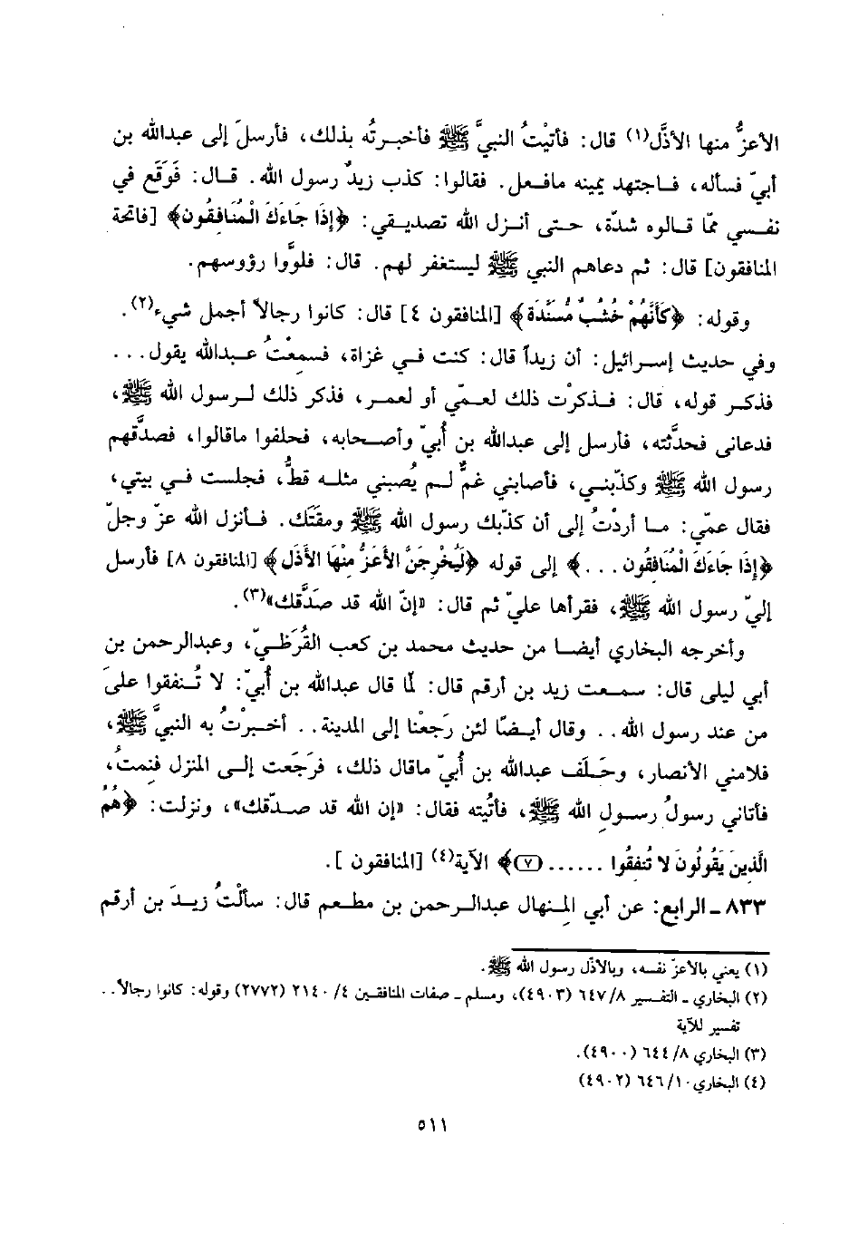 الْأَعَز مِنْهَا الْأَذَل قَالَ: فَأتيت النَّبِي صلى الله عَلَيْهِ وَسلم فَأَخْبَرته بذلك، فَأرْسل إِلَى عبد الله بن أبي فَسَأَلَهُ، فاجتهد يَمِينه مَا فعل. فَقَالُوا: كذب زيدٌ رَسُول الله. قَالَ: فَوَقع فِي نَفسِي مِمَّا قَالُوهُ شدَّة، حَتَّى أنزل الله تصديقي: {إِذا جَاءَك المُنَافِقُونَ} [فَاتِحَة المُنَافِقُونَ] قَالَ: ثمَّ دعاهم النَّبِي صلى الله عَلَيْهِ وَسلم ليَسْتَغْفِر لَهُم. قَالَ: فلووا رؤوسهم.