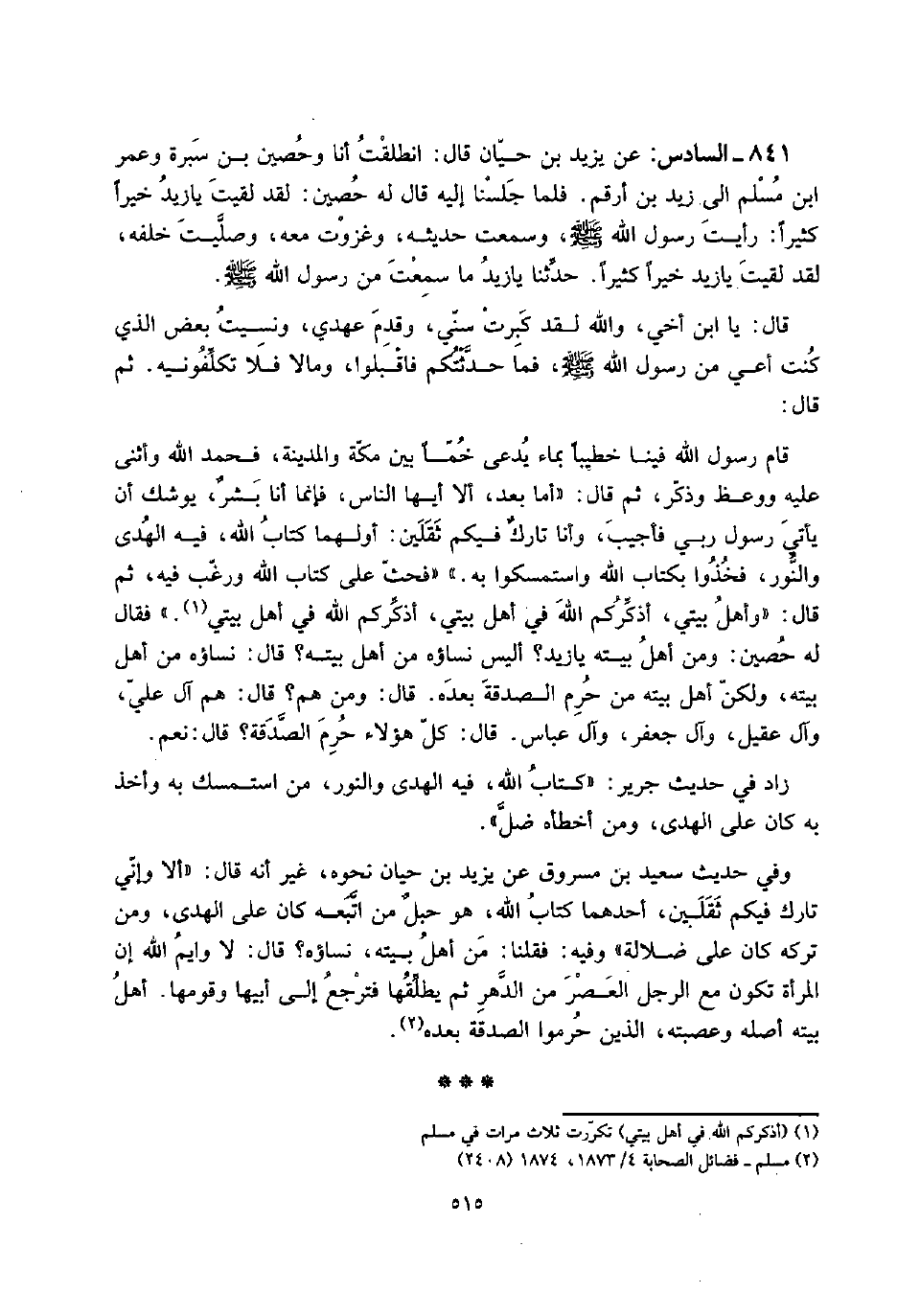 قَامَ رَسُول الله فِينَا خَطِيبًا بِمَاء يدعى فَمَا بَين مَكَّة وَالْمَدينَة، فَحَمدَ الله وَأثْنى عَلَيْهِ وَوعظ وَذكر، ثمَّ قَالَ: " أما بعد، أَلا أَيهَا النَّاس، فَإِنَّمَا أَنا بشرٌ، يُوشك أَن يأتى رَسُول رَبِّي فَأُجِيب، وَأَنا تاركٌ فِيكُم ثقلين: أولهماكتاب الله، فِيهِ الْهدى والنور، فَخُذُوا بِكِتَاب الله واستمسكوا بِهِ. " فَحَث على كتاب الله وَرغب فِيهِ، ثمَّ قَالَ: " وَأهل بَيْتِي، أذكركم الله فِي أهل بَيْتِي، أذكركم الله فِي أهل بَيْتِي. " فَقَالَ لَهُ حُصَيْن: وَمن أهل بَيته يَا زيد؟ أَلَيْسَ نساؤه من أهل بَيته؟ قَالَ: نساؤه من أهل بَيته، وَلَكِن أهل بَيته من حرم الصَّدَقَة بعده. قَالَ: وَمن هم؟ قَالَ: هم آل عَليّ، وَآل عقيل، وَآل جَعْفَر، وَآل عَبَّاس. قَالَ: كل هَؤُلَاءِ حرم الصَّدَقَة؟ قَالَ: نعم.