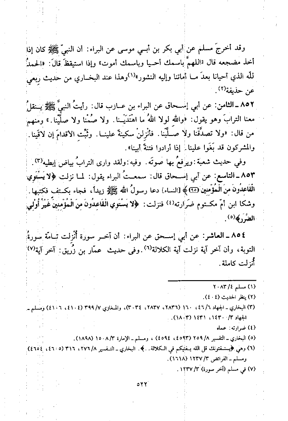 853 - التَّاسِع: عَن أبي إِسْحَاق قَالَ: سَمِعت الْبَراء يَقُول: لما نزلت {لَا يَسْتَوِي الْقَاعِدُونَ من الْمُؤمنِينَ} [النِّسَاء] دَعَا رَسُول الله صلى الله عَلَيْهِ وَسلم زيدا، فجَاء بكتف فكتبها.