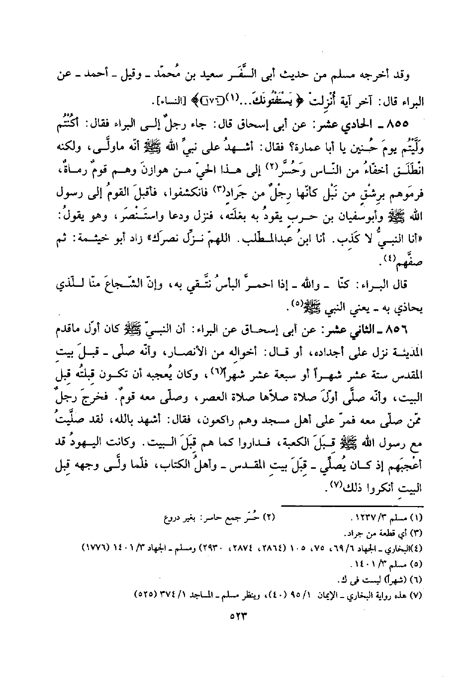 856 - الثَّانِي عشر: عَن أبي إِسْحَاق عَن الْبَراء: أَن النَّبِي صلى الله عَلَيْهِ وَسلم كَانَ أول مَا قدم الْمَدِينَة نزل على أجداده، أَو قَالَ: أَخْوَاله من الْأَنْصَار، وَأَنه صلى - قبل بَيت الْمُقَدّس سِتَّة عشر شهرا أَو سَبْعَة عشر شهرا، وَكَانَ يُعجبهُ أَن تكون قبلته قبل الْبَيْت، وَأَنه صلى أول صَلَاة صلاهَا الْعَصْر، وَصلى مَعَه قومٌ. فَخرج رجلٌ مِمَّن صلى مَعَه فَمر على أهل مَسْجِد وهم رَاكِعُونَ، فَقَالَ: أشهد بِاللَّه، لقد صليت مَعَ رَسُول الله صلى الله عَلَيْهِ وَسلم قبل الْكَعْبَة، فَدَارُوا كَمَا هم قبل الْبَيْت. وَكَانَت الْيَهُود قد أعجبهم إِذْ كَانَ يُصَلِّي - قبل بَيت الْمُقَدّس - وَأهل الْكتاب، فَلَمَّا ولى وَجهه قبل الْبَيْت أَنْكَرُوا ذَلِك.