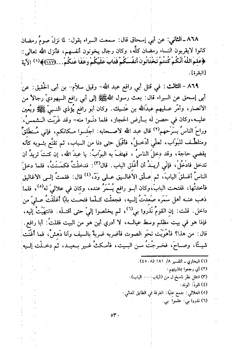 869 - الثَّالِث: فِي قتل أبي رَافع عبد الله - وَقيل سَلام - بن أبي الْحقيق: عَن أبي إِسْحَق عَن الْبَراء قَالَ: بعث رَسُول الله صلى الله عَلَيْهِ وَسلم إِلَى أبي رَافع الْيَهُودِيّ رجَالًا من الْأَنْصَار، وَأمر عَلَيْهِم عبد الله بن عتِيك. وَكَانَ أَبُو رَافع يُؤْذِي النَّبِي صلى الله عَلَيْهِ وَسلم ويعين عَلَيْهِ، وَكَانَ فِي حصن لَهُ بِأَرْض الْحجاز، فَلَمَّا دنوا مِنْهُ - وَقد غربت الشَّمْس، وَرَاح النَّاس بسرحهم قَالَ عبد الله لأَصْحَابه: اجلسوا مَكَانكُمْ، فَإِنِّي منطلقٌ ومتلطف للبواب، لعَلي أَدخل، فَأقبل حَتَّى دنا من الْبَاب، ثمَّ تقنع بِثَوْبِهِ كَأَنَّهُ يقْضِي حَاجَة، وَقد دخل النَّاس، فَهَتَفَ بِهِ البواب: يَا عبد الله، إِن كنت تُرِيدُ أَن تدخل فَادْخُلْ، فَإِنِّي أُرِيد أَن أغلق الْبَاب. قَالَ: فَدخلت فَكَمَنْت، فَلَمَّا دخل النَّاس أغلق الْبَاب، ثمَّ علق الأغاليق على ود، قَالَ: فَقُمْت إِلَى الأغاليق فأخدتها، ففتحت الْبَاب، وَكَانَ أَبُو رَافع يسمر عِنْده، وَكَانَ فِي علالي لَهُ، فَلَمَّا ذهب عَنهُ أهل سمره صعدت إِلَيْهِ، فَجعلت كلما فتحت بَابا أغلقت عَليّ من دَاخل. قلت: إِن الْقَوْم نذروا بِي، لم يخلصوا إِلَيّ حَتَّى أَقتلهُ. فانتهيت إِلَيْهِ، فَإِذا هُوَ فِي بَيت مظلم وسط عِيَاله، لَا ادري أَيْن هُوَ من الْبَيْت فَقلت: أَبَا رَافع.