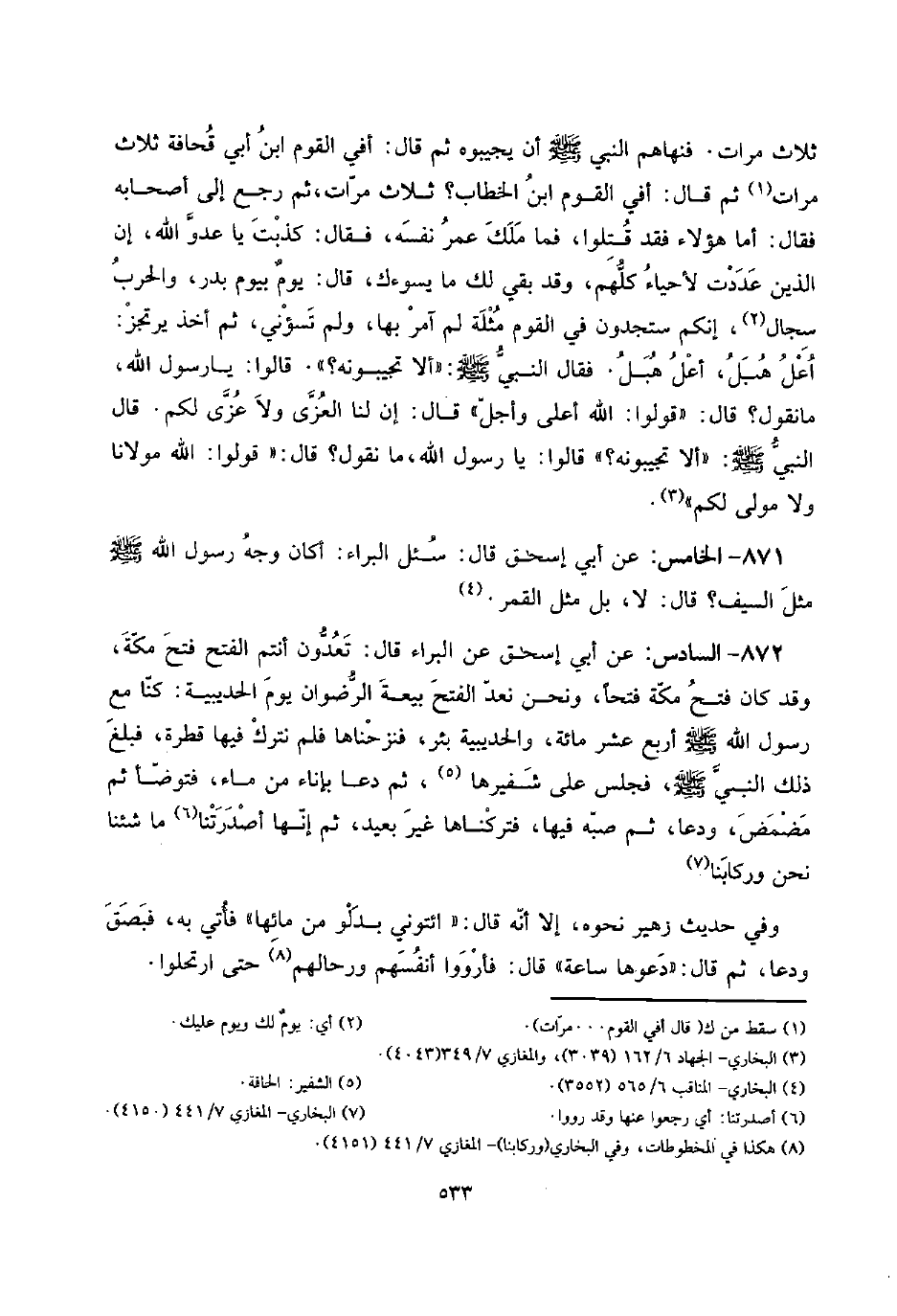 871 - الْخَامِس: عَن أبي إِسْحَق قَالَ: سُئِلَ الْبَراء: أَكَانَ وَجه رَسُول الله صلى الله عَلَيْهِ وَسلم مثل السَّيْف؟ قَالَ: لَا، بل مثل الْقَمَر.