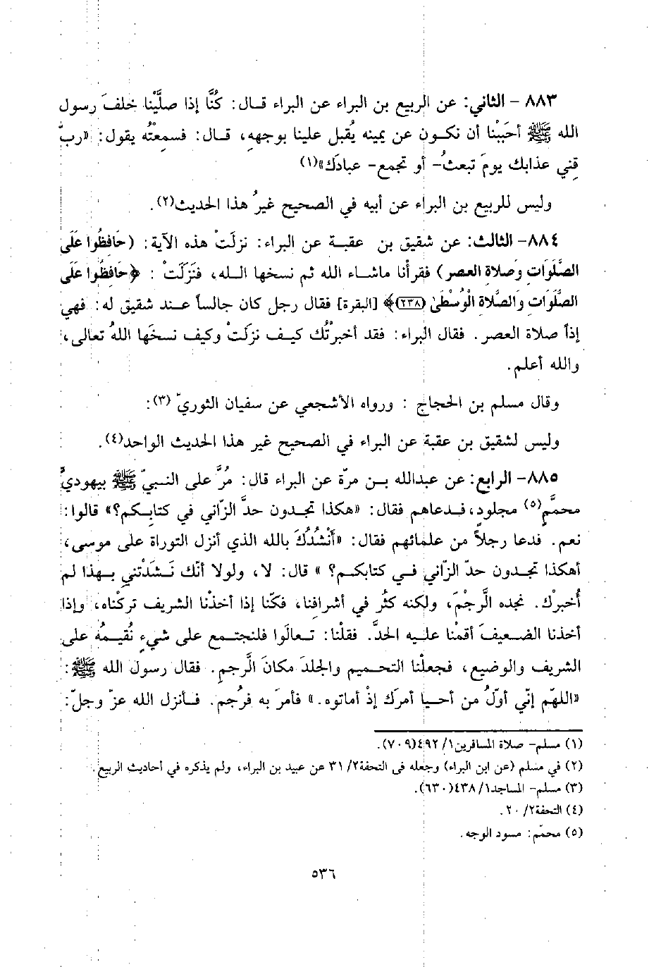 885 - الرَّابِع: عَن عبد الله بن مرّة عَن الْبَراء قَالَ: مر على النَّبِي صلى الله عَلَيْهِ وَسلم بِيَهُودِيٍّ محممٍ مجلودٍ، فَدَعَاهُمْ فَقَالَ: " هَكَذَا تَجِدُونَ حد الزَّانِي فِي كتابكُمْ؟ " قَالُوا: نعم. فَدَعَا رجلا من عُلَمَائهمْ فَقَالَ: " أنْشدك بِاللَّه الَّذِي أنزل التَّوْرَاة على مُوسَى، أهكذا تَجِدُونَ حد الزَّانِي فِي كتابكُمْ؟ " قَالَ: لَا، وَلَوْلَا أَنَّك نشدتني بِهَذَا لم أخْبرك. نجده الرَّجْم، وَلكنه كثر فِي أشرافنا، فَكُنَّا إِذا أَخذنَا الشريف تَرَكْنَاهُ، وَإِذا أَخذنَا الضَّعِيف أَقَمْنَا عَلَيْهِ الْحَد. فَقُلْنَا: تَعَالَوْا فلنجتمع على شيءٍ نقيمه على الشريف والوضيع، فَجعلنَا التحميم وَالْجَلد مَكَان الرَّجْم. فَقَالَ رَسُول الله صلى الله عَلَيْهِ وَسلم: " اللَّهُمَّ إِنِّي أول من أَحْيَا امرك إِذْ أماتوه ". فَأمر بِهِ فرجم. فَأنْزل الله عز وَجل: